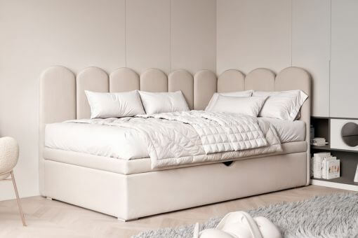 Coraz większą popularnością cieszą się łóżka tapicerowane dla dzieci, które łączą estetykę, komfort i praktyczne rozwiązania – takie jak pojemna szuflada lub skrzynia na pościel i zabawki. To świetne rozwiązanie szczególnie w mniejszych pokojach, gdzie każdy centymetr przestrzeni ma znaczenie. Do szuflady lub skrzyni z łatwością zmieścisz: pościel i koce, sezonowe ubrania lub zabawki i gry. To także doskonała okazja, by nauczyć dziecko utrzymywania porządku – pokazując, że każda rzecz ma swoje miejsce.