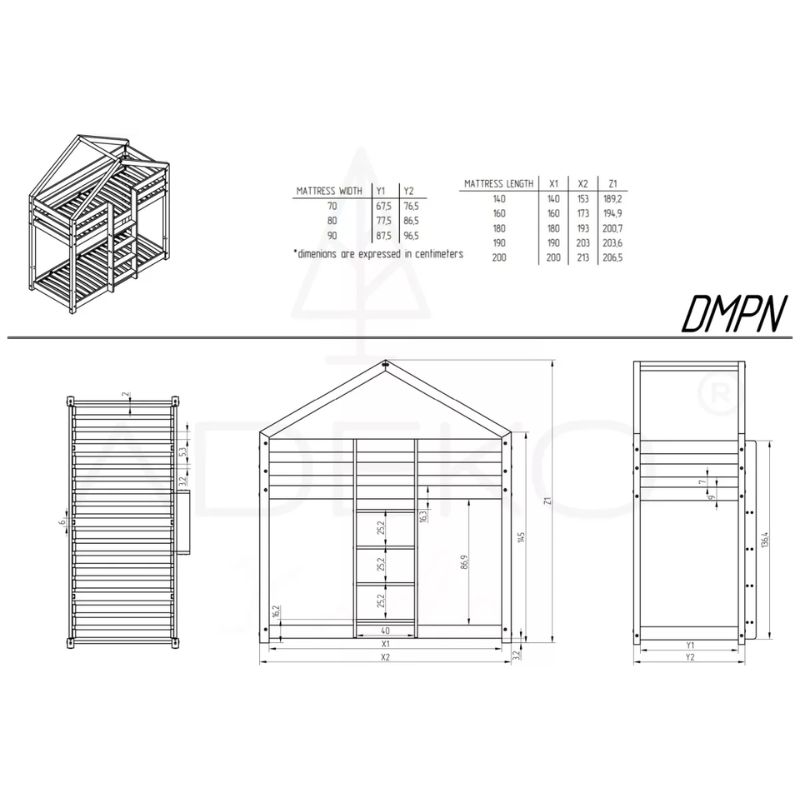 Model łóżka piętrowego DMPN z drabinką na środku jest dostępne w wielu rozmiarach od 140 do 200 cm długości (wybrany rozmiar = rozmiar materaca). Dzięki temu spokojnie dopasujesz łóżko do dziecięcego wnętrza.