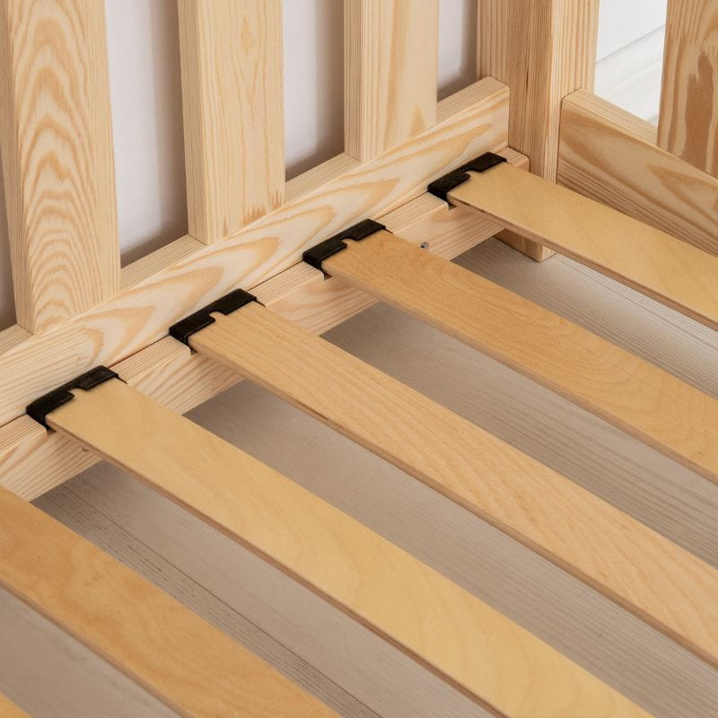 Łóżko dziecięce posiada barierki boczne i na tylnej ścianie łóżka. Do dziecięcego łóżka w komplecie dołączony jest stelaż z elastycznymi listwami. Tego typu stelaż wspiera pracę materaca poprawiając komfort snu i wpływając na redukcję zużycia materaca.