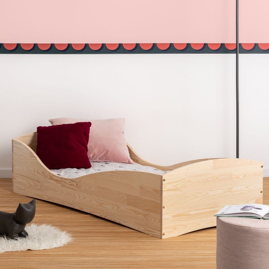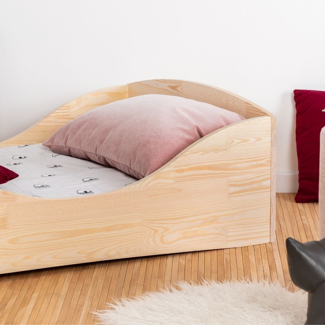 Model łóżka dziecięcego Pepe posiada podwyższone, zaokrąglone boki, które zabezpieczają dziecko przed upadkiem z łóżka w trakcie snu.