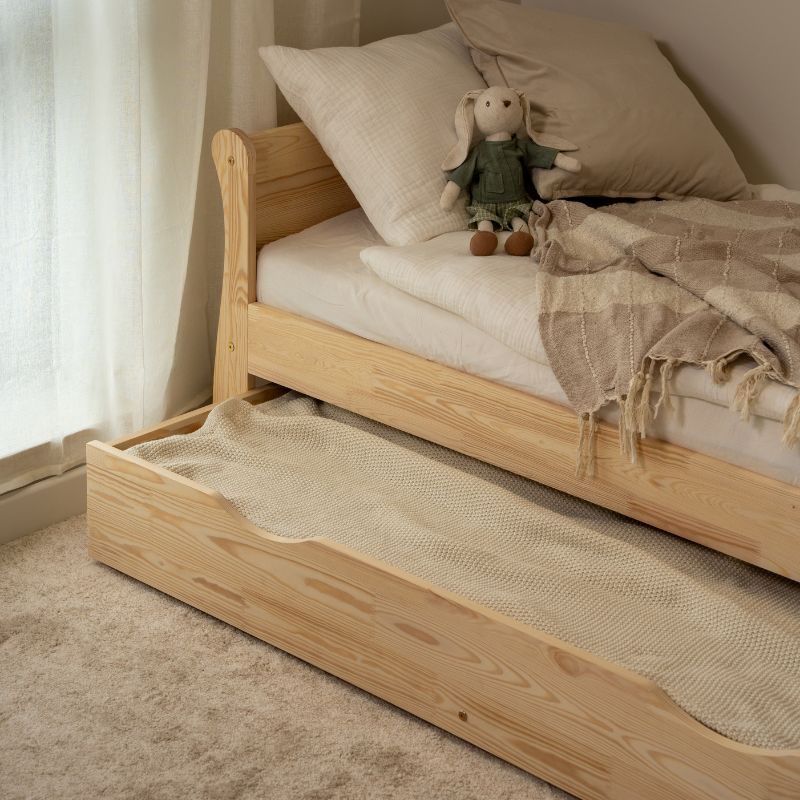 Łóżko Roma dostępne jest w wersji z praktyczną szufladą na kółkach. Szuflada wysuwa się lekko i cicho, dzięki czemu dziecko może korzystać z niej samodzielnie.