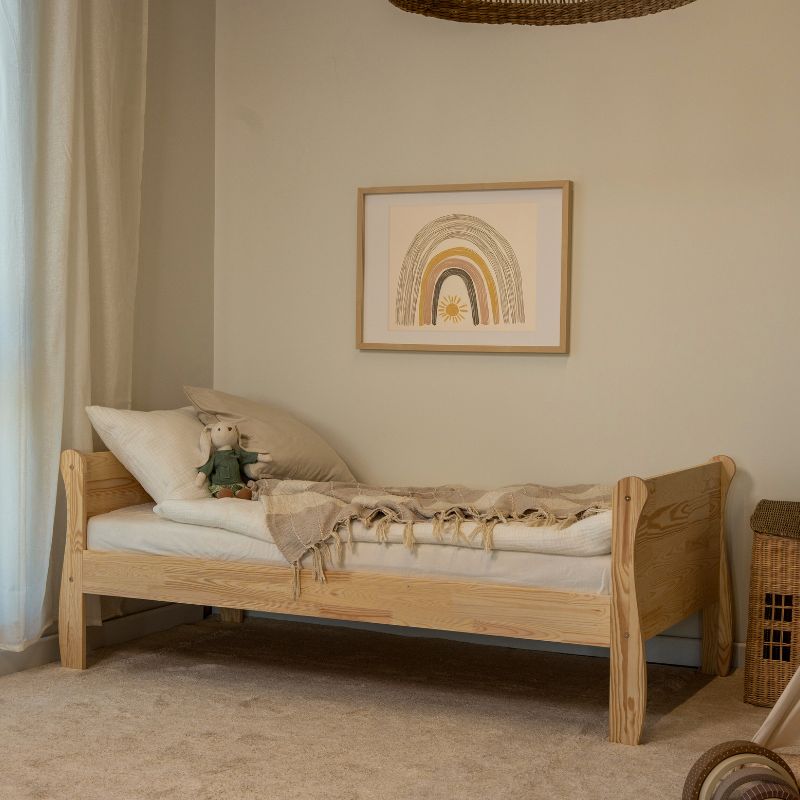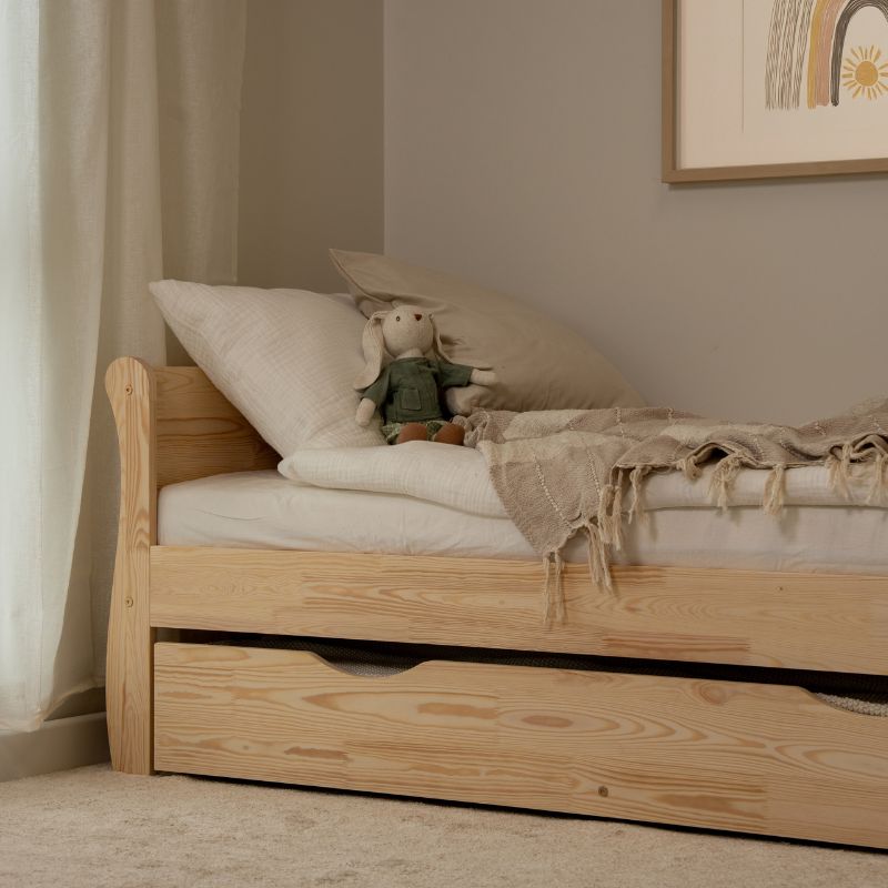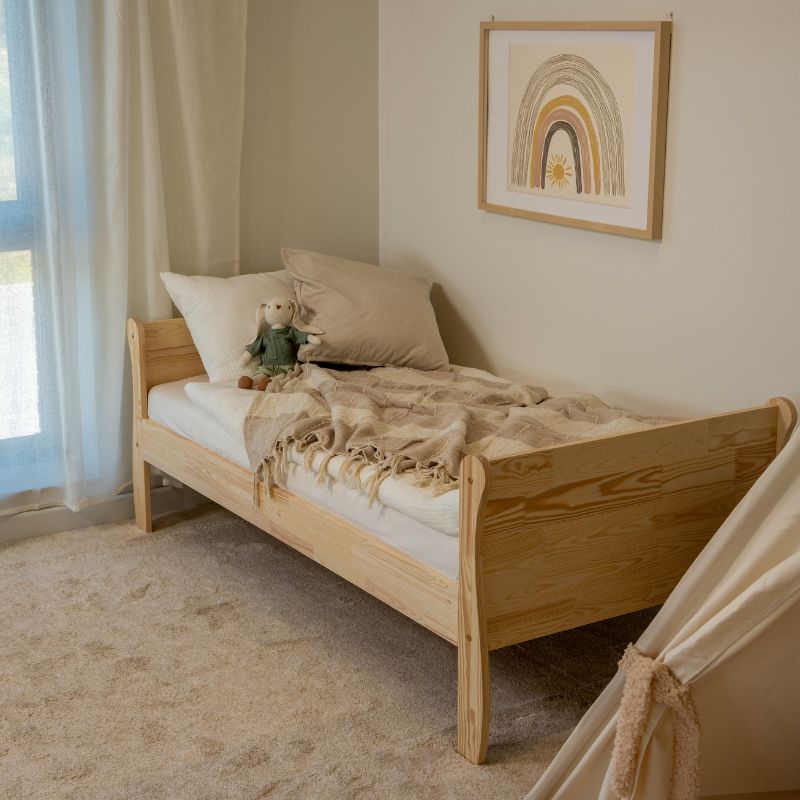 Prosta forma i naturalny odcień sosny sprawiają, że łóżko świetnie wpisuje się w styl skandynawski – jasne, przytulne i uporządkowane wnętrza. Jasne drewno optycznie powiększa przestrzeń i wprowadza ciepły, przytulny klimat.