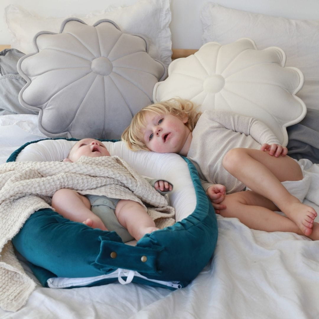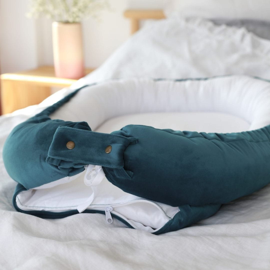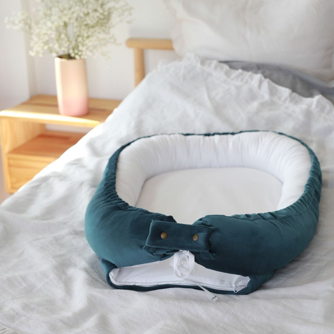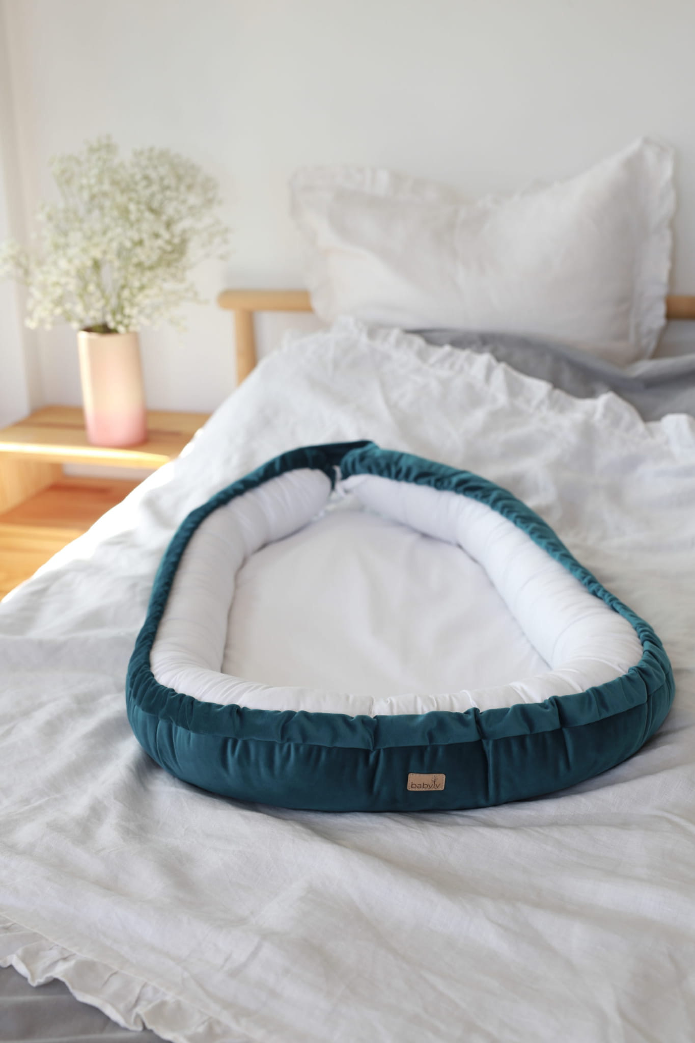 Gniazdko dla niemowlaka Babyly wykonane jest miękkiego, przyjemnego velvetu z pięknym oryginalnym kolorze. Ma gładkie, pozwalające się wyciszyć wnętrze oraz wyjmowany materac, dzięki czemu kokon można prac w pralce.