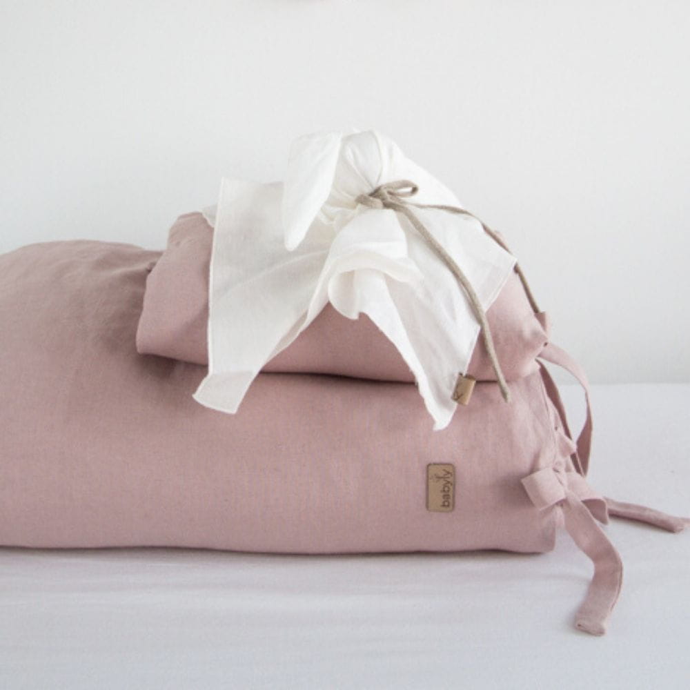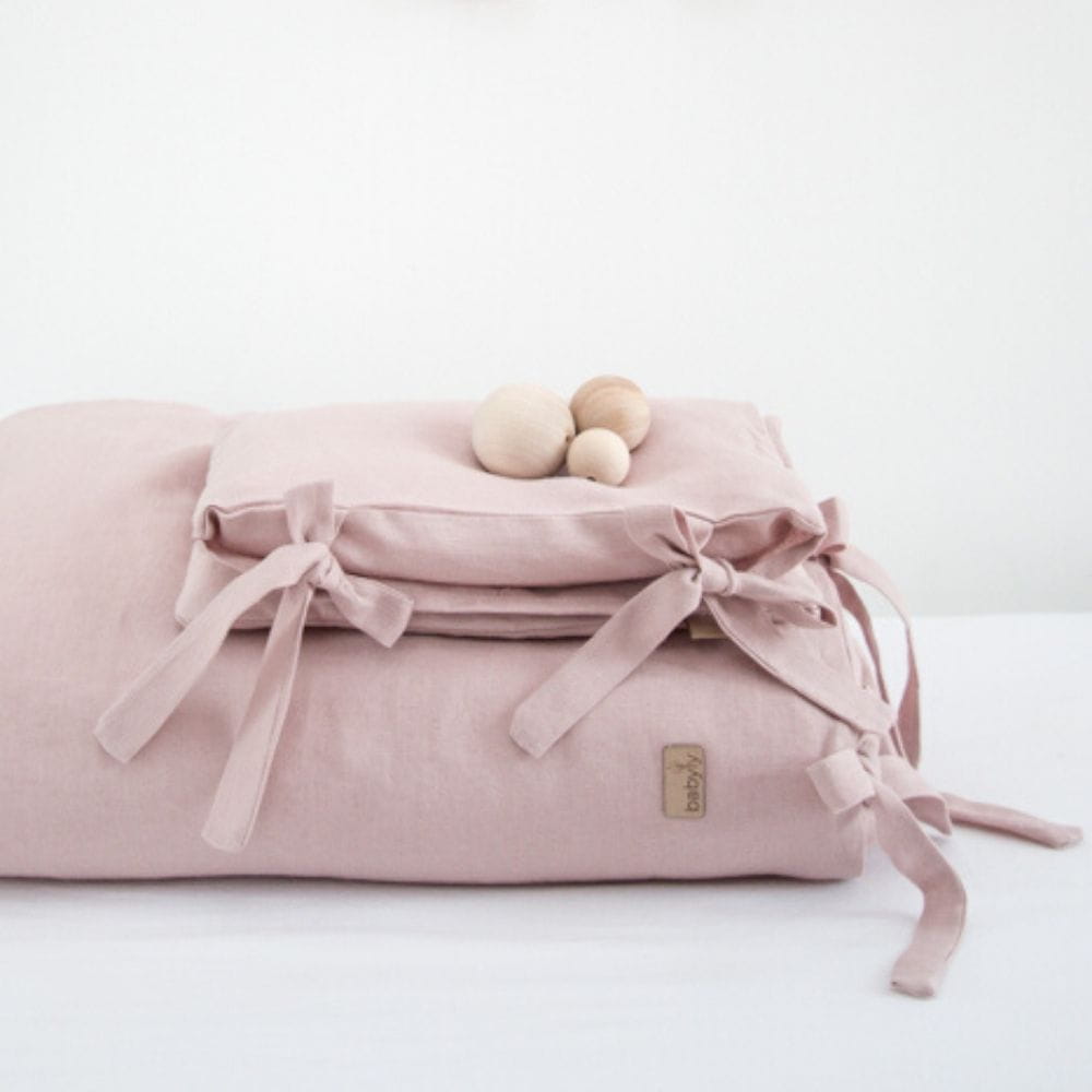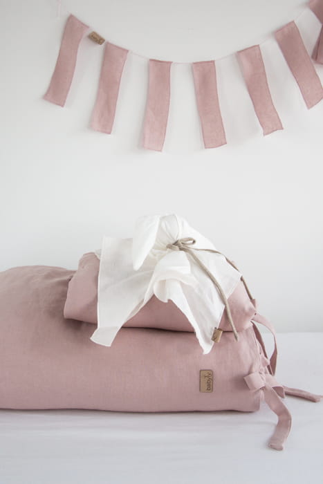 Piękna, lekka, pościel dziecięca wykonana ze zmiękczonego lnu w kolorze pudrowego różu i ozdobiona wiązanymi troczkami. Pościel lniana idealnie otuli każde dziecko w czasie drzemki i długiego snu.