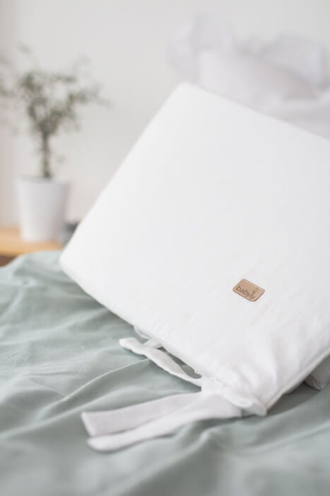 Biały kolor ochraniacza jest niezwykle uniwersalny – doskonale komponuje się z wyprawką w każdym kolorze i wzorze, tworząc spójną, estetyczną aranżację pokoiku. Dzięki praktycznemu mocowaniu na troczki, ochraniacz łatwo i stabilnie przymocujesz do szczebelków łóżeczka, bez ryzyka przesuwania się czy zsuwania.