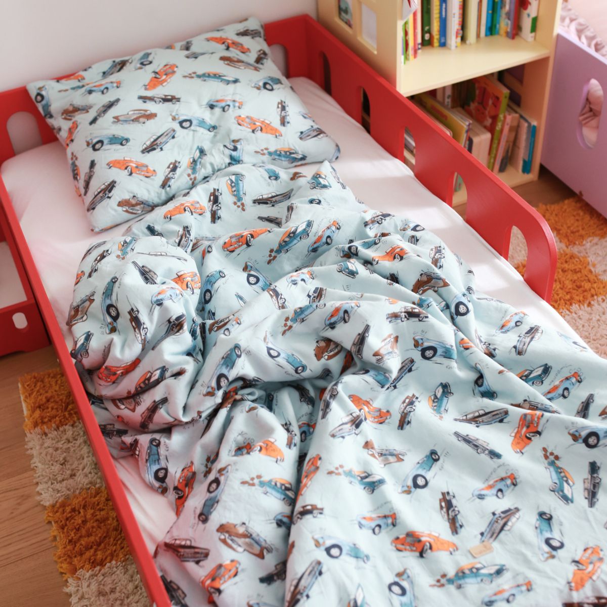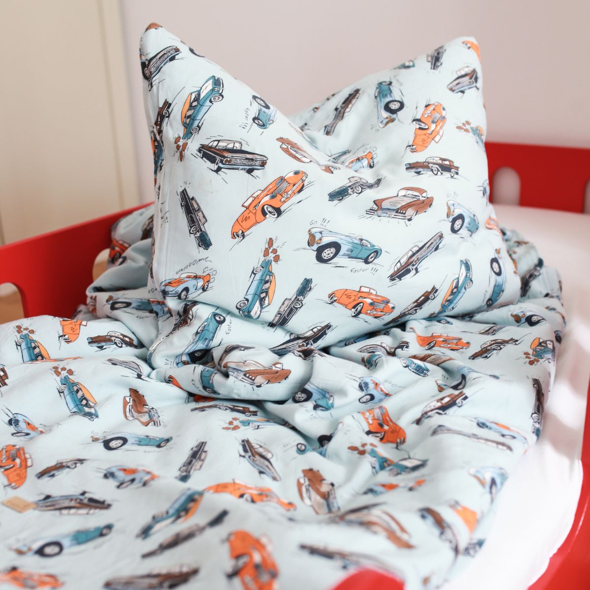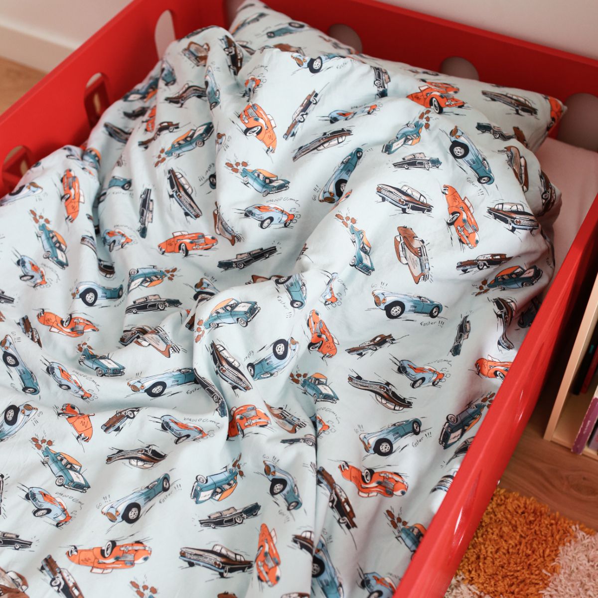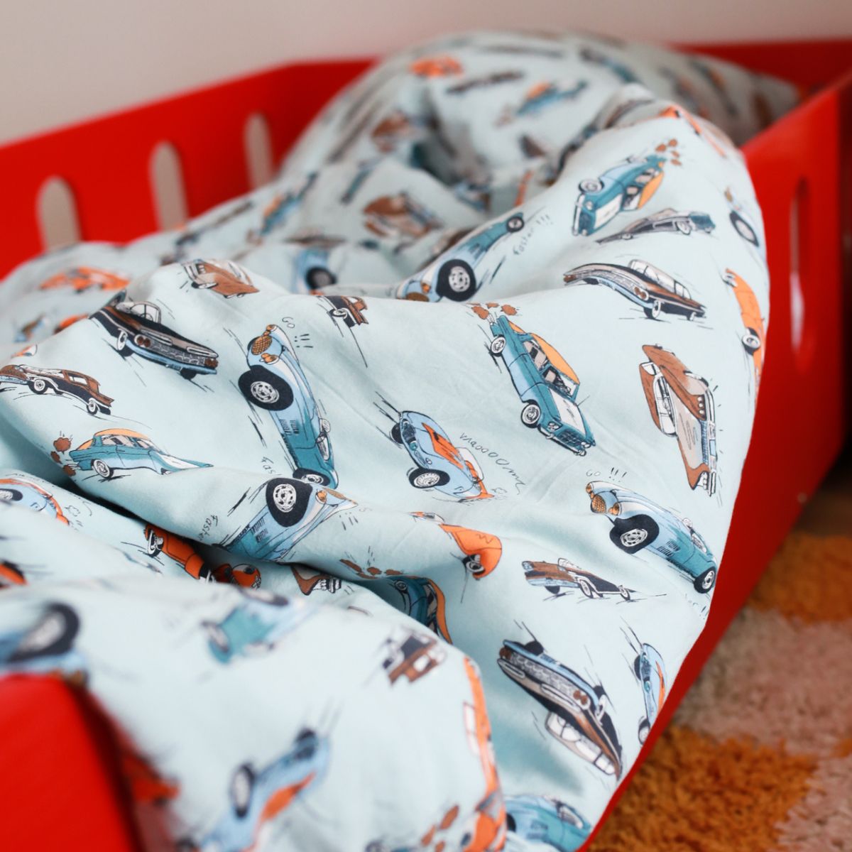 Kolorowa, pełna energii pościel w wyścigówki zachwyci każdego małego kierowcę. To świetny sposób, by zachęcić dziecko do spania „na swoim” – a jednocześnie wprowadzić do pokoju radosny, chłopięcy klimat.