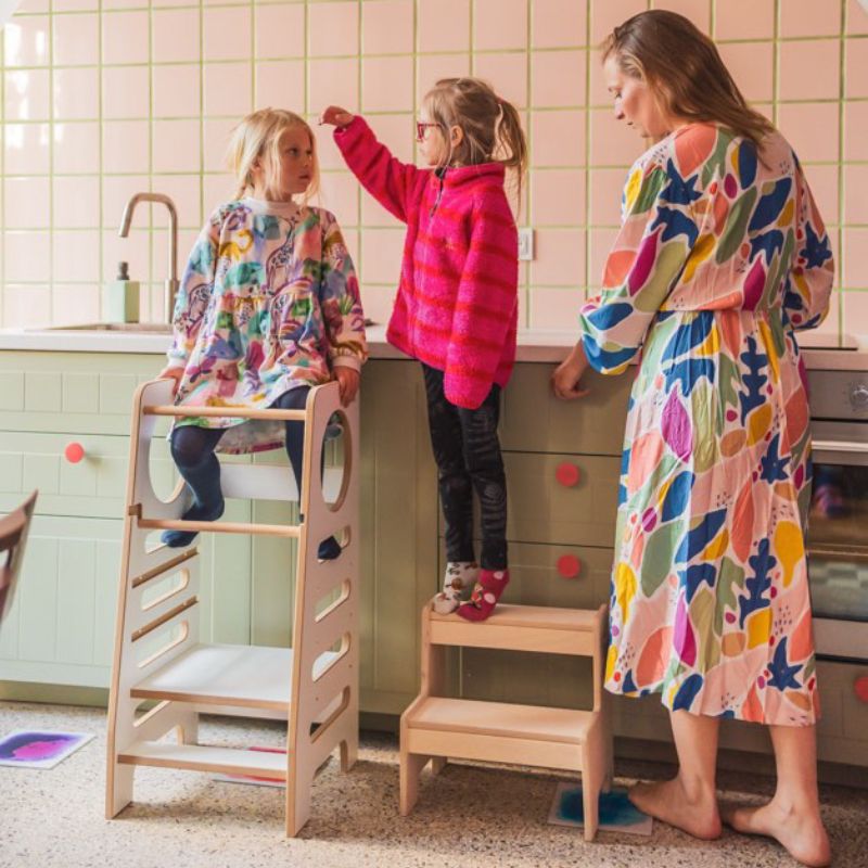 Kitchen helper to wyjątkowe połączenie podestu, podnóżka i kuchennego pomocnika, które na stałe wpisze się w domowe przestrzenie. Ten drewniany mebel umożliwia dzieciom pełne uczestnictwo w codziennych obowiązkach domowych, które wcześniej były poza ich zasięgiem. Teraz dziecko może samodzielnie kroić, mieszać i przygotowywać proste potrawy. W ten sposób wzmacnia swoje poczucie wartości, rozwija umiejętność samodzielności, pewność siebie oraz doskonali koordynację ruchową.