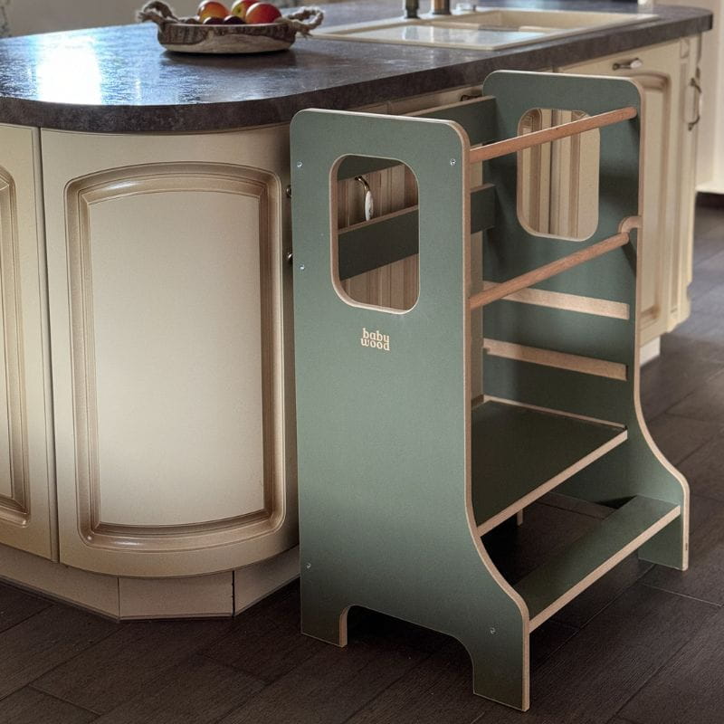 Kuchenny pomocnik Babywood został stworzony z myślą o zapewnieniu dzieciom bezpiecznej przestrzeni do zabawy, zgodnie z duchem filozofii Montessori. Wyposażony w liczne rozwiązania, znacząco podnosi poziom bezpieczeństwa. Zaokrąglone krawędzie oraz dodatkowy szczebelek uniemożliwiający zsuwanie się dziecka z podestu zapewniają bezpieczną i beztroską zabawę.
