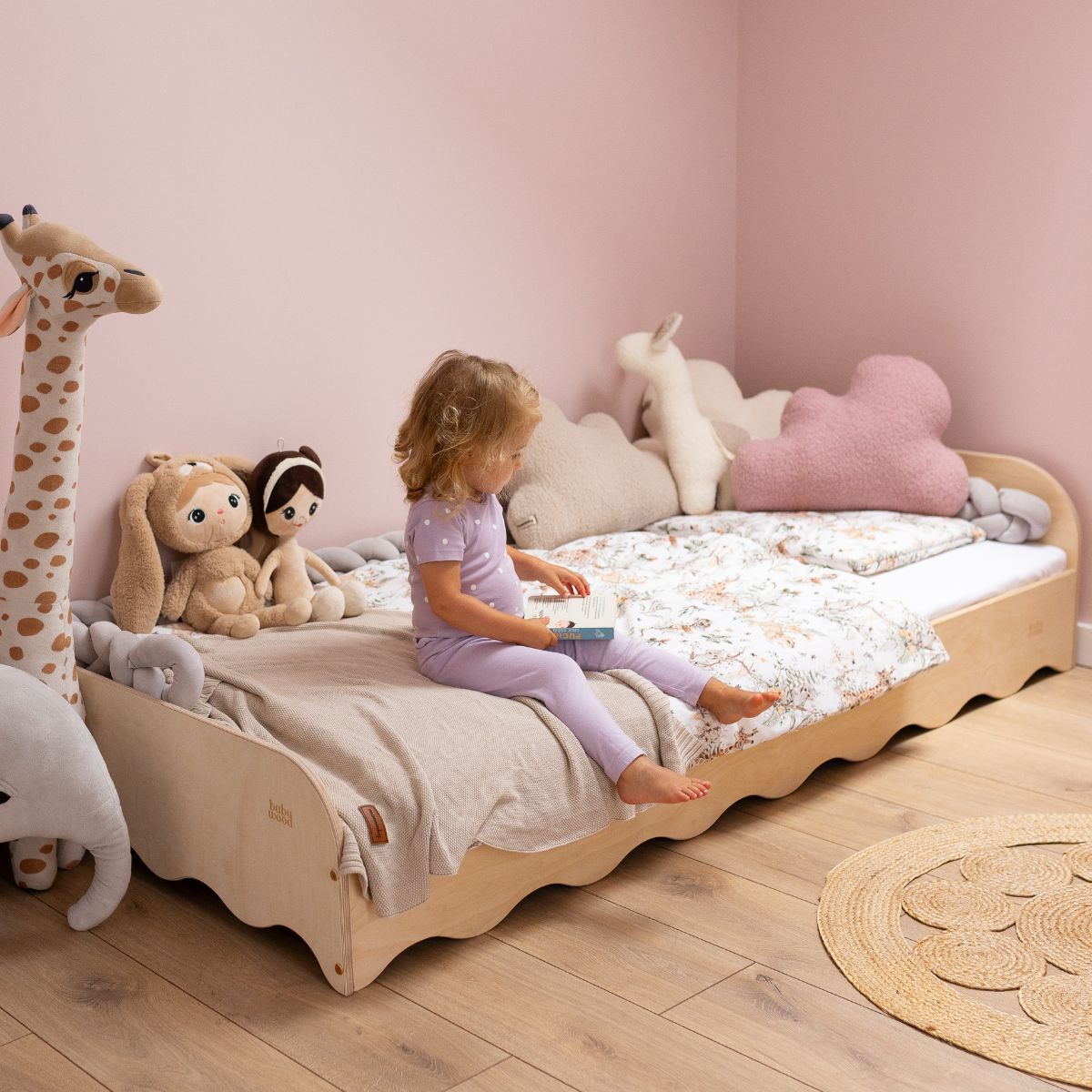 Niskie dziecięce łóżko z falbanką i zagłówkiem – subtelne, bezpieczne, pełne uroku
