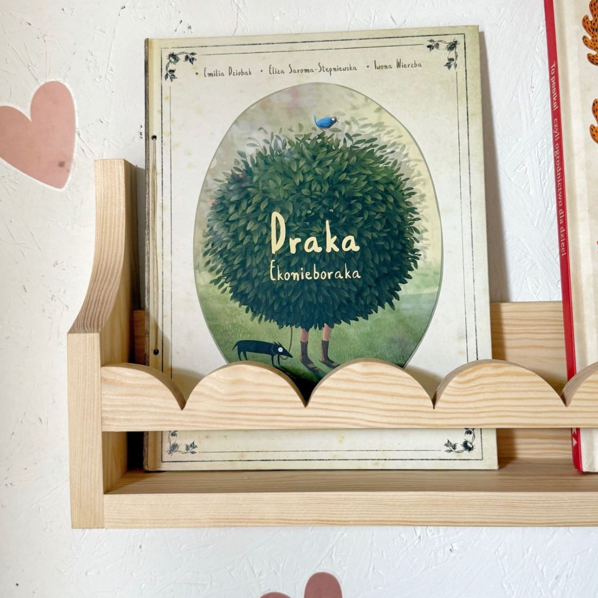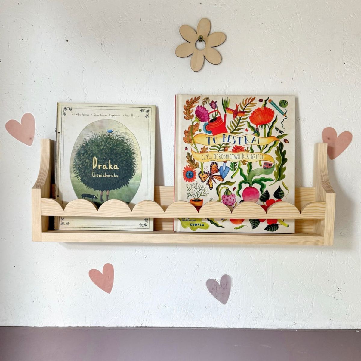 Praktyczna forma półki pozwala na wygodne przechowywanie książek, drobiazgów czy dekoracji, a delikatna falbanka pełni nie tylko funkcję dekoracyjną, lecz także praktyczną – zapobiega zsuwaniu się przedmiotów. Dzięki temu półka łączy estetykę z użytecznością, tworząc harmonijny i funkcjonalny element każdego wnętrza.