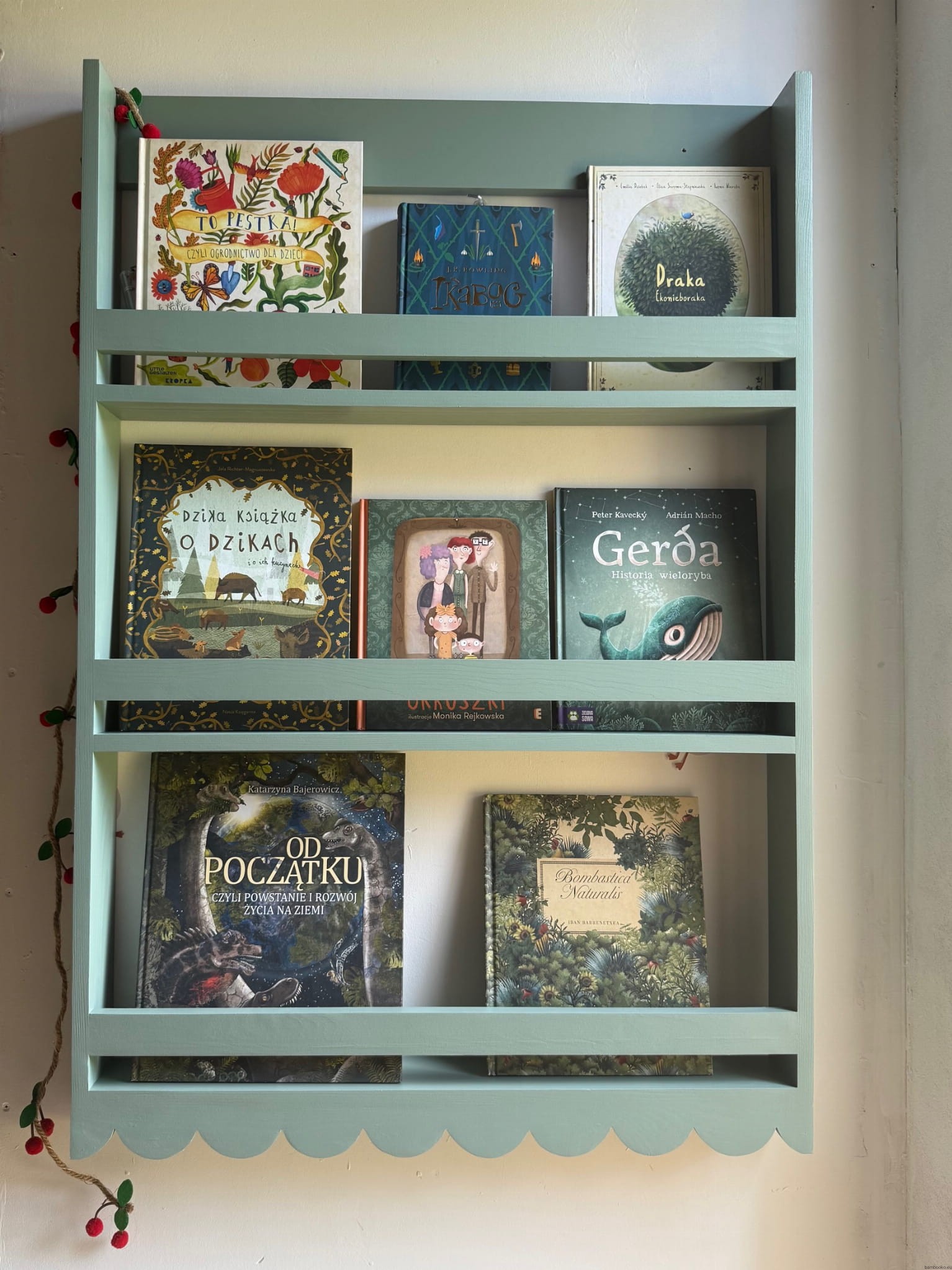 Półeczka na książki z falbanką — dziecięca baśń zamknięta w drewnie
