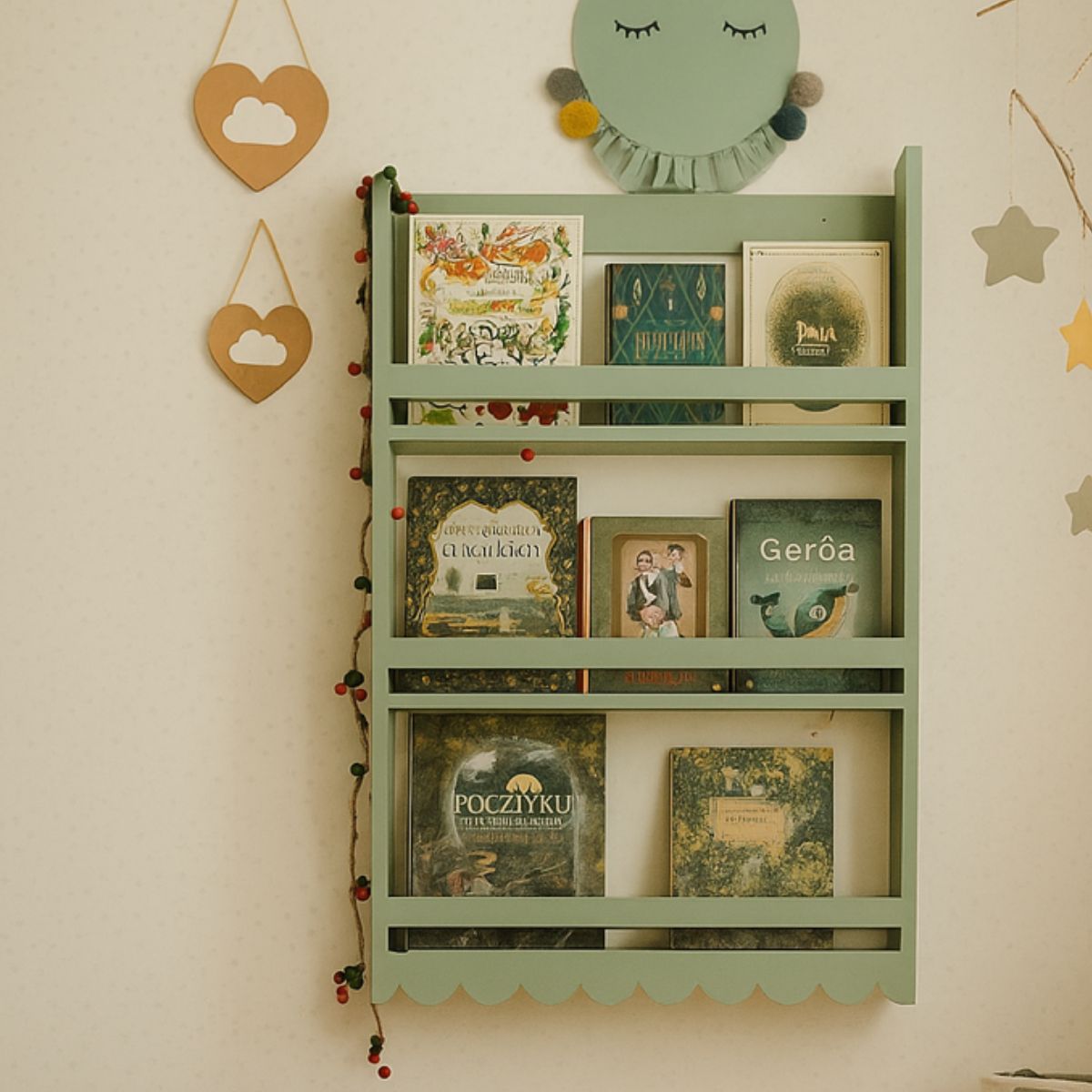 Stworzona z myślą o małych odkrywcach, czytelnikach i marzycielach – doskonale sprawdzi się jako regał na pierwsze książeczki, ulubione zabawki, figurki, pluszaki czy dekoracje. Trzy poziomy półek zostały zaprojektowane tak, aby pomieściły wszystkie dziecięce skarby, ułatwiały segregację i uczyły porządku, nie rezygnując przy tym z przytulnego, magicznego klimatu.