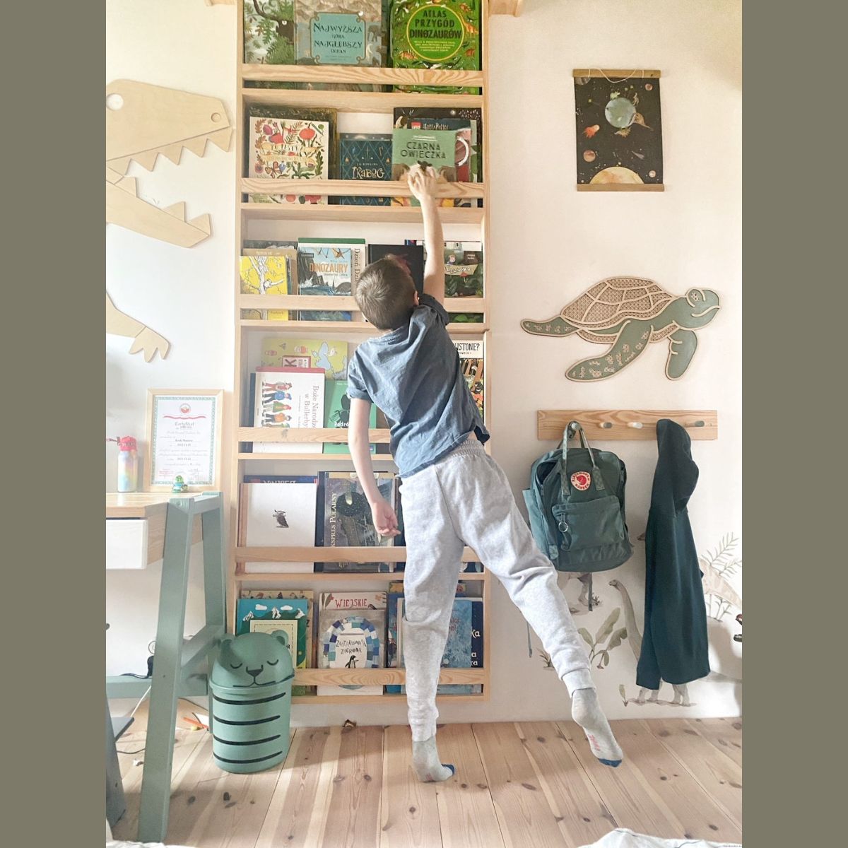 Stwórz wyjątkową domową biblioteczkę sięgającą od podłogi aż po sufit! Zestaw dwóch drewnianych półeczek w stylu Montessori to przemyślane rozwiązanie, które pomaga wprowadzić porządek, zachęca dziecko do samodzielności i pięknie uzupełnia wystrój pokoju.