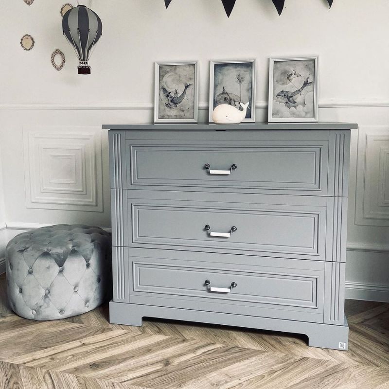 Komoda idealnie sprawdzi się zarówno w pokoju niemowlaka, jak i starszego dziecka. Jej klasyczny styl oraz pięknie zdobione frezy nadają meblowi ponadczasowej elegancji, dzięki czemu doskonale pasuje do aranżacji pokoju dziewczynki i chłopca. Charakterystycznym elementem kolekcji są ręcznie robione porcelanowe uchwyty, które dodają meblowi wyjątkowego uroku i podkreślają jego stylowy charakter.