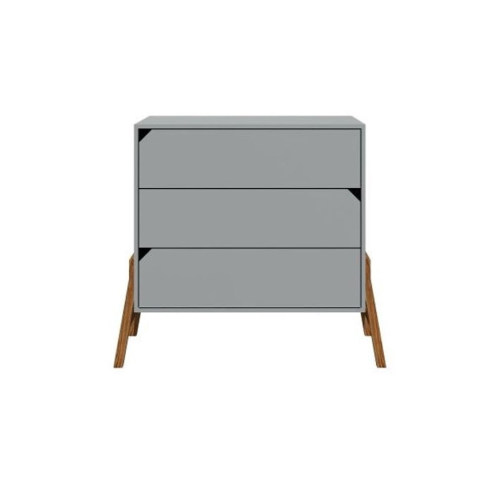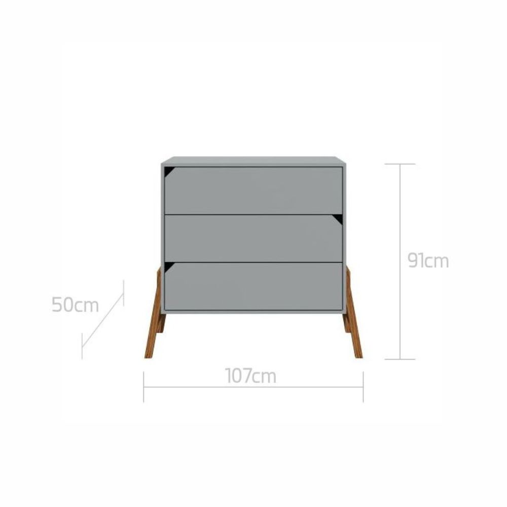 Minimalistyczna forma, brak klasycznych uchwytów oraz charakterystyczne trójkątne wycięcia nadają komodzie nowoczesnego i lekkiego wyglądu. Całość uzupełniają naturalne, drewniane nogi, które dodają elegancji i wpisują mebel w styl skandynawski.