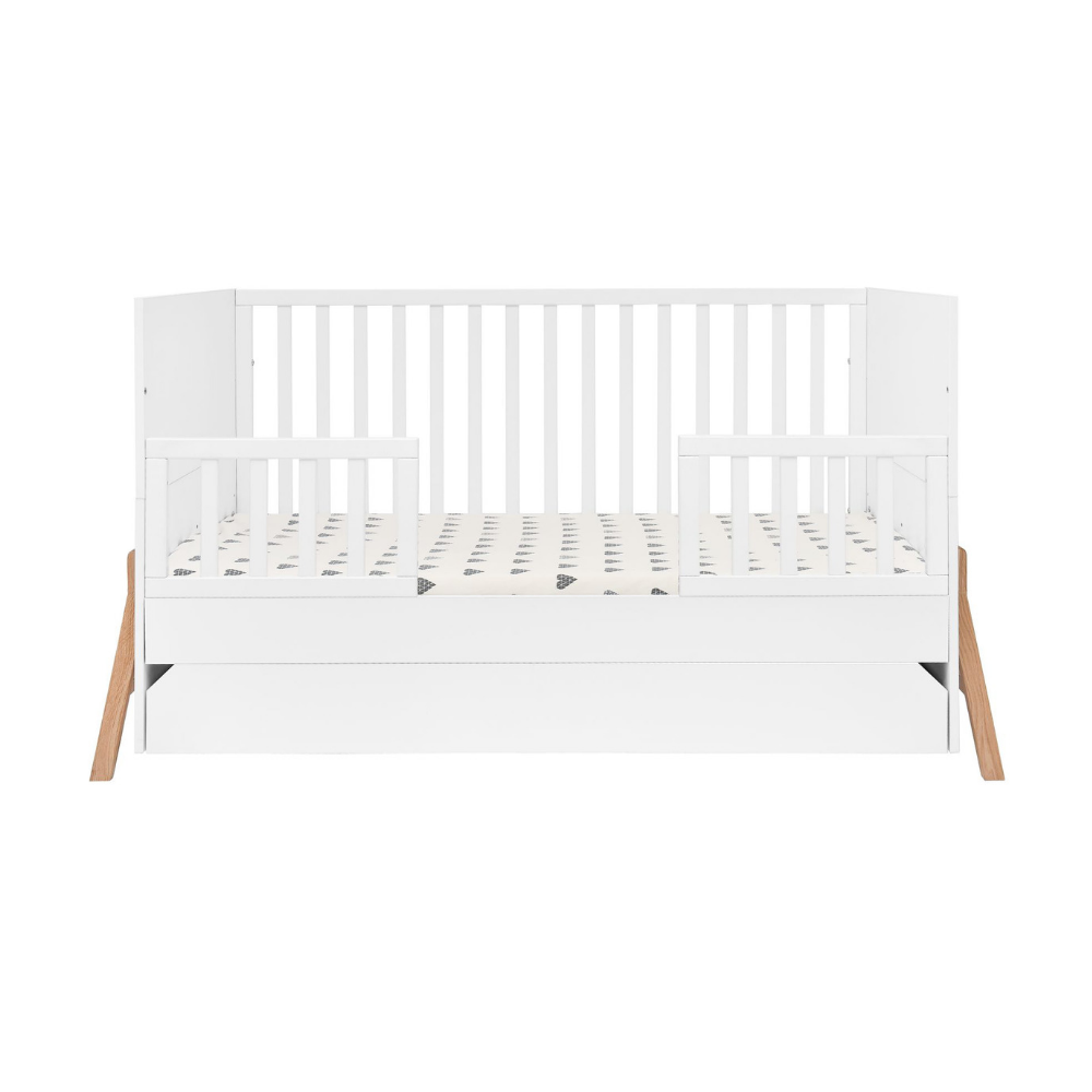 Dwa wyjmowane szczebelki umożliwiają dziecku samodzielne wchodzenie i wychodzenie z łóżeczka, kiedy będzie na to gotowe. Dodatkowo istnieje możliwość dokupienia jednej lub dwóch barierek ochronnych, które zwiększają bezpieczeństwo podczas snu.