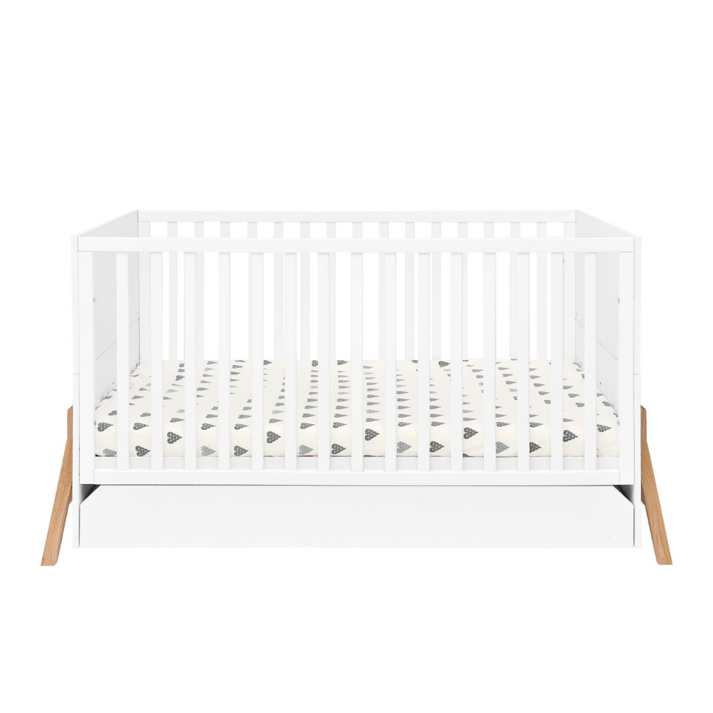 Łóżeczko zostało wyposażone w pojemną szufladę na prowadnicach marki Häfele z funkcją cichego domykania. To idealne miejsce na pościel, kocyki czy inne dziecięce akcesoria. Uwaga: szuflada nie posiada maskownicy, więc jej zawartość jest częściowo widoczna gdy leżysko znajduje się na wysokim poziomie.