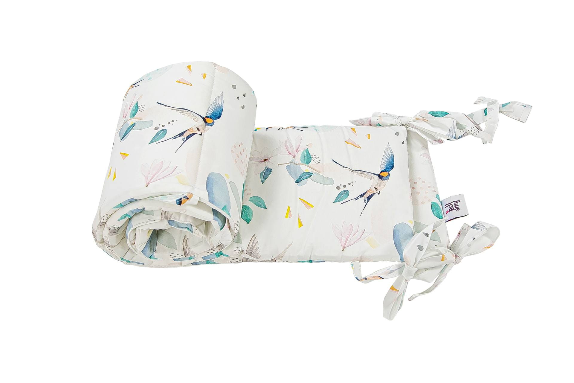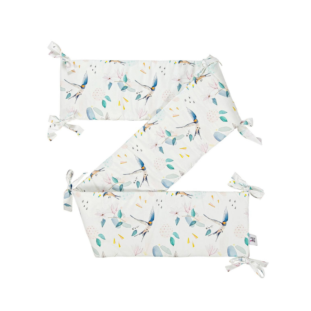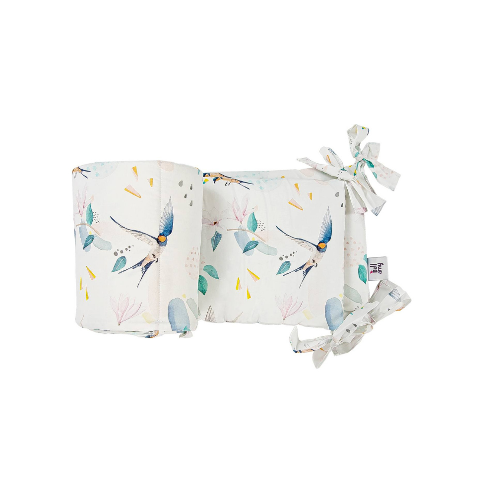 Ochraniacz do dziecięcego łóżeczka w delikatny wzór składający się z ptaków i listków. Dzięki materiałowi w 100% bawełnianemu oraz antyalergicznemu wypełnieniu kolekcja Fly jest lekka i miła w dotyku, a także zapewnia termoregulację.
