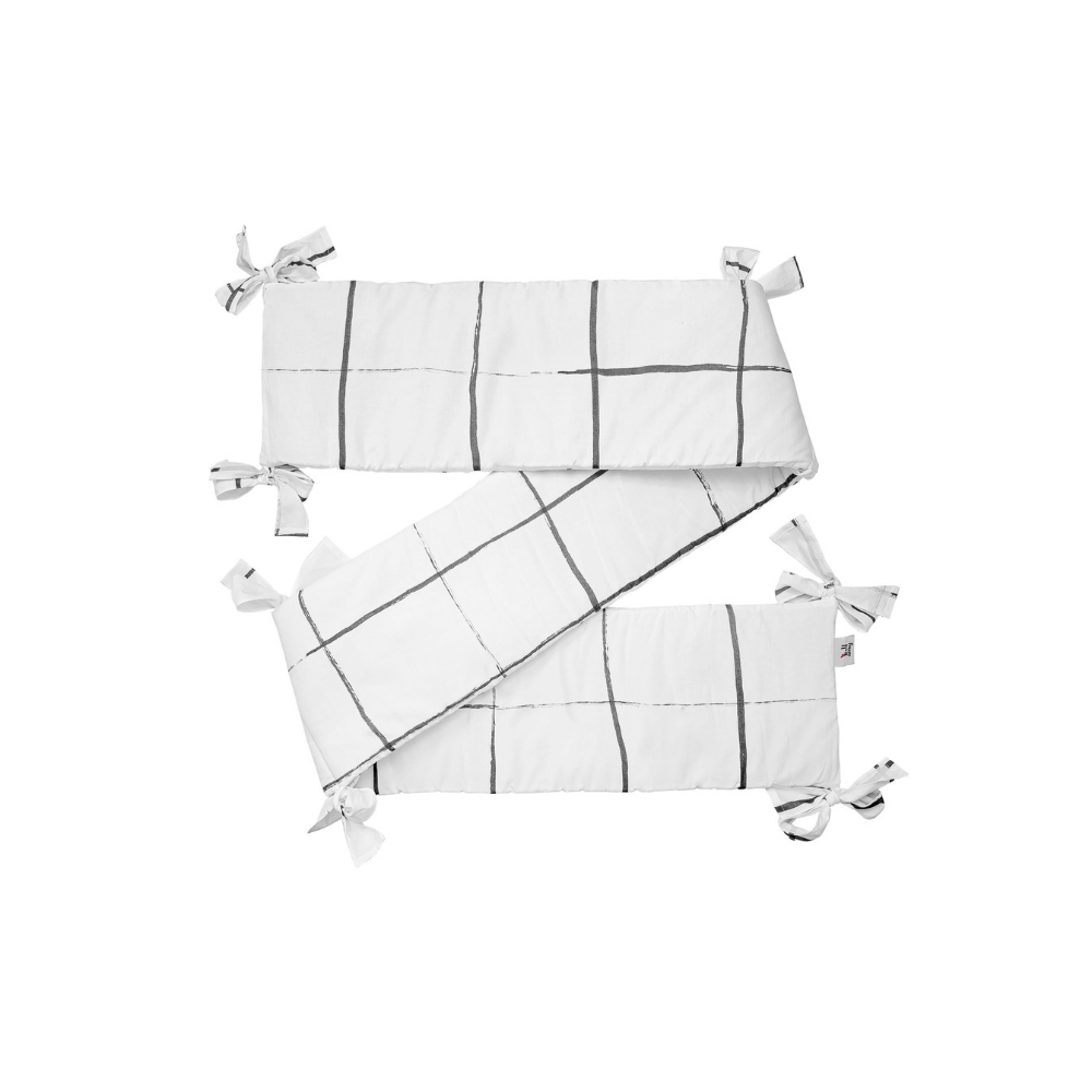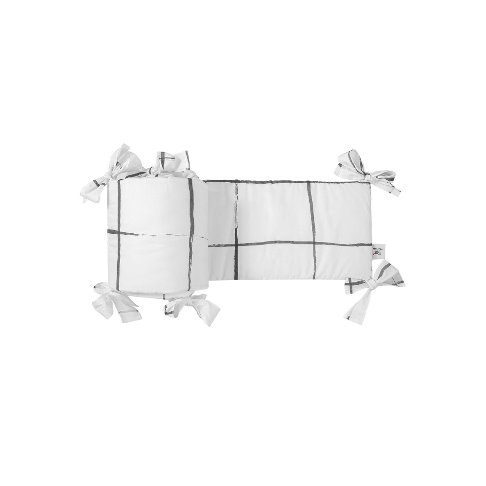 Ochraniacz do dziecięcego łóżeczka ma piękny delikatny wzór - czarna kratka na białym tle. Wzór będzie idealny do nowoczesnych aranżacji dziecięcych wnętrz.