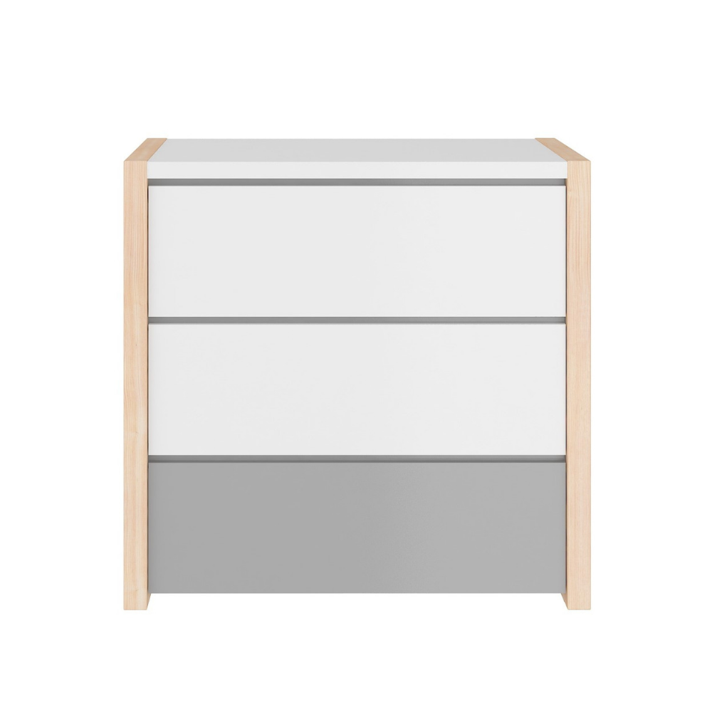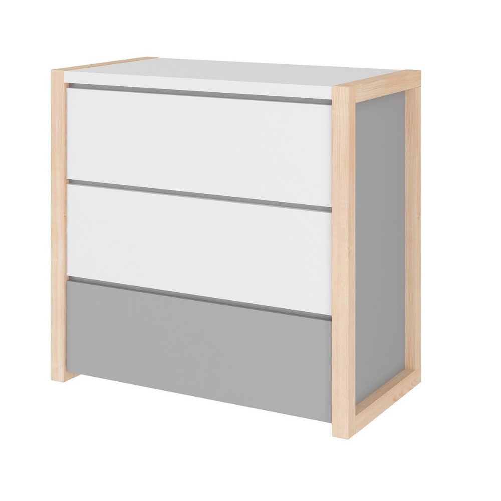 Komoda została wyposażona w trzy pojemne szuflady, które pomieszczą wszystko, co potrzebne na co dzień – od śpioszków i pieluszek, po ubrania i dziecięce drobiazgi. Dzięki temu łatwo utrzymać porządek i mieć wszystkie niezbędne rzeczy zawsze pod ręką.