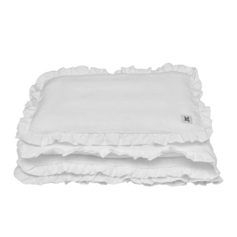 Lniana biała pościel z falbanką dla dziecka w rozmiarze 140x200 cm wykończona delikatną falbanką będzie piękną dekoracją wnętrza.