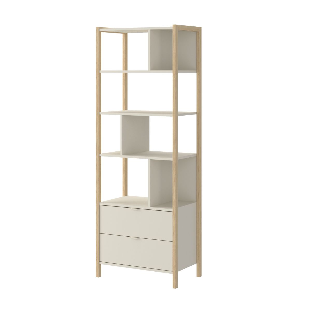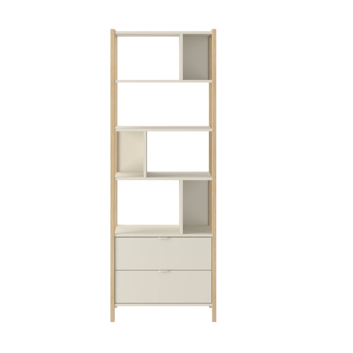 Mebel wyposażony jest w pięć otwartych półek w asymetrycznym układzie oraz dwie pojemne szuflady w dolnej części. Dzięki temu ułatwia organizację przestrzeni – pomieści zarówno książki, segregatory i akcesoria szkolne, jak i dekoracje czy drobiazgi codziennego użytku.