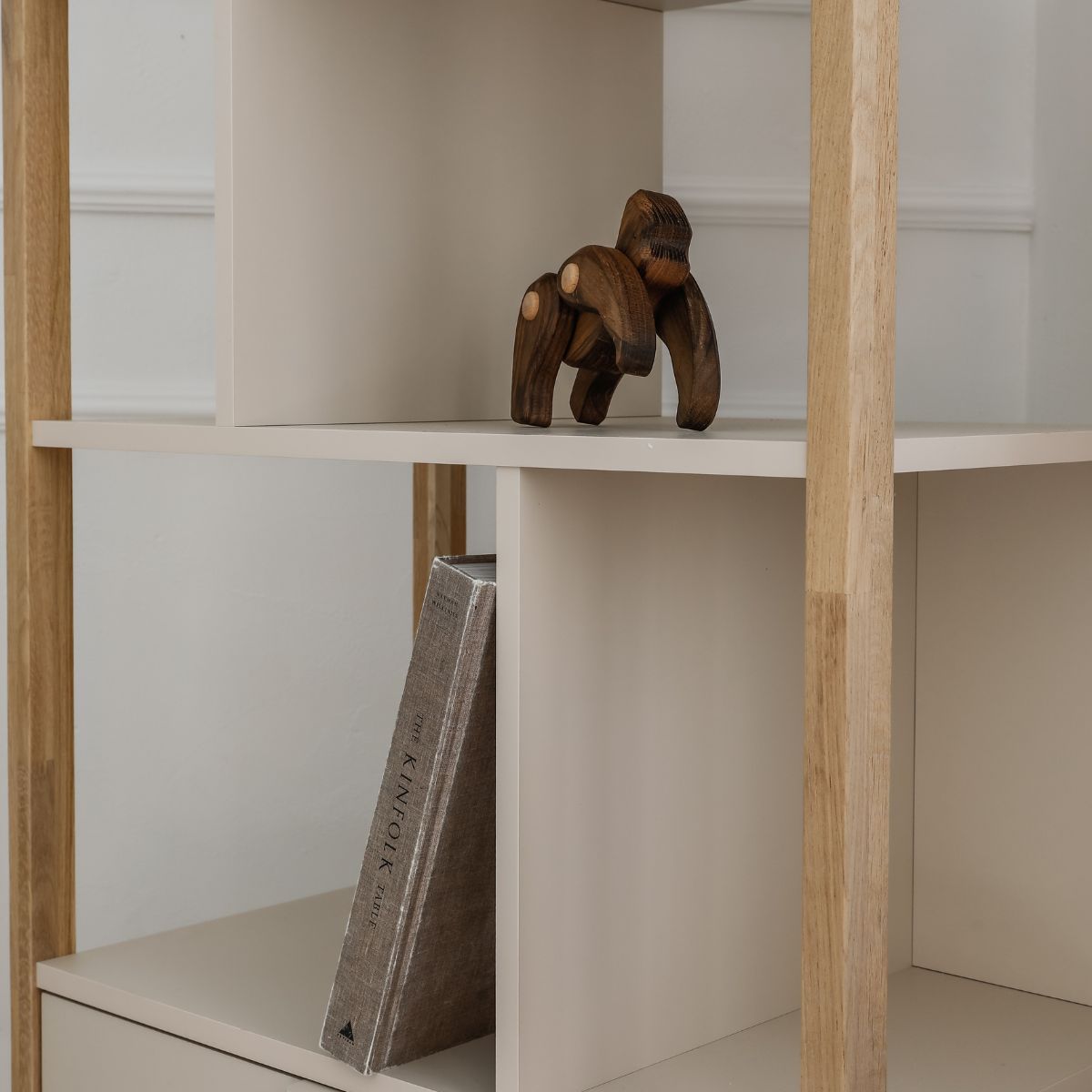 Elegancki odcień latte nadaje wnętrzu ciepła i przytulności, a nogi z naturalnego drewna dębowego podkreślają nowoczesny charakter regału. To mebel, który równie dobrze pasuje do pokoju dziecka, nastolatka, jak i do salonu czy domowego biura.