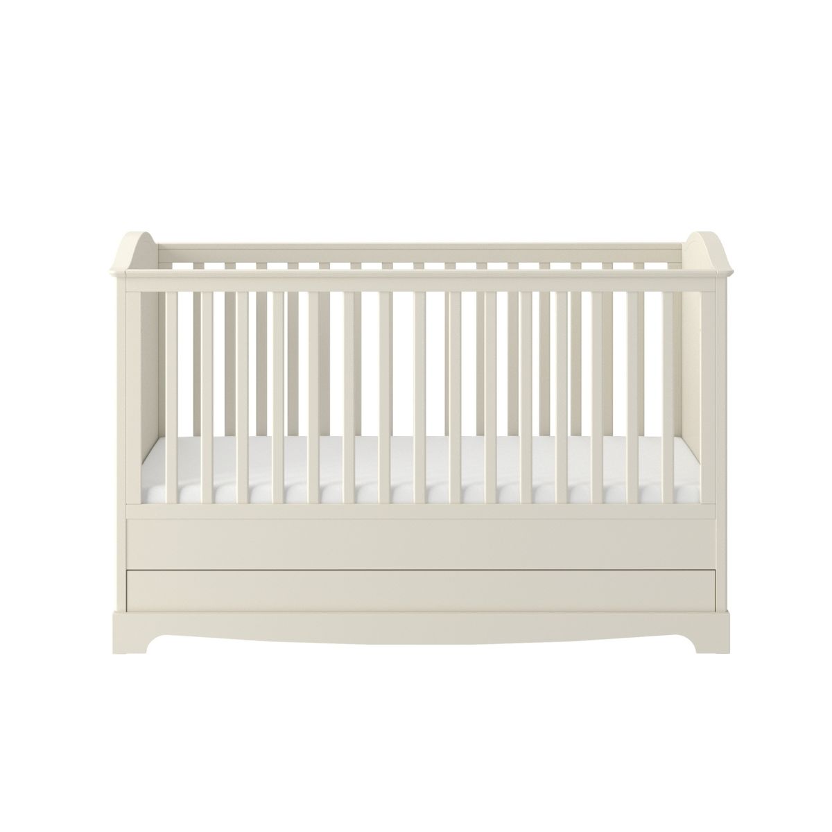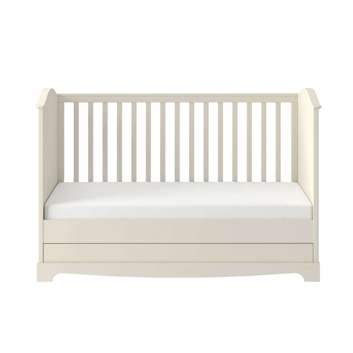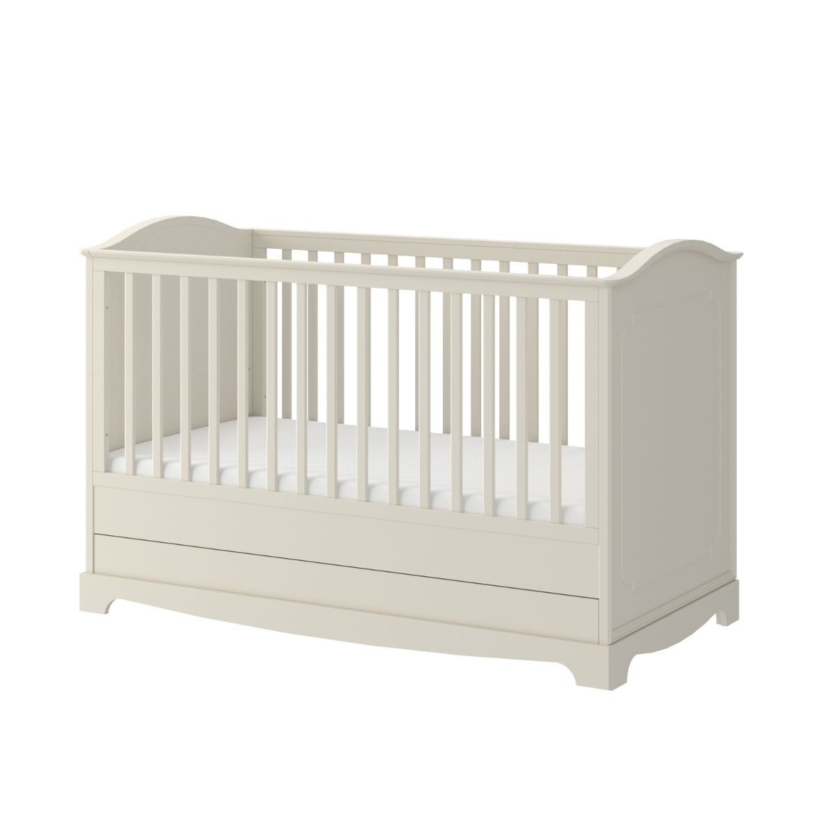 Łóżeczko wyposażono także w funkcjonalną dolną szufladę, która pozwala na praktyczne przechowywanie pościeli, tekstyliów, zabawek lub akcesoriów, pomagając w utrzymaniu porządku w pokoju niemowlaka.
