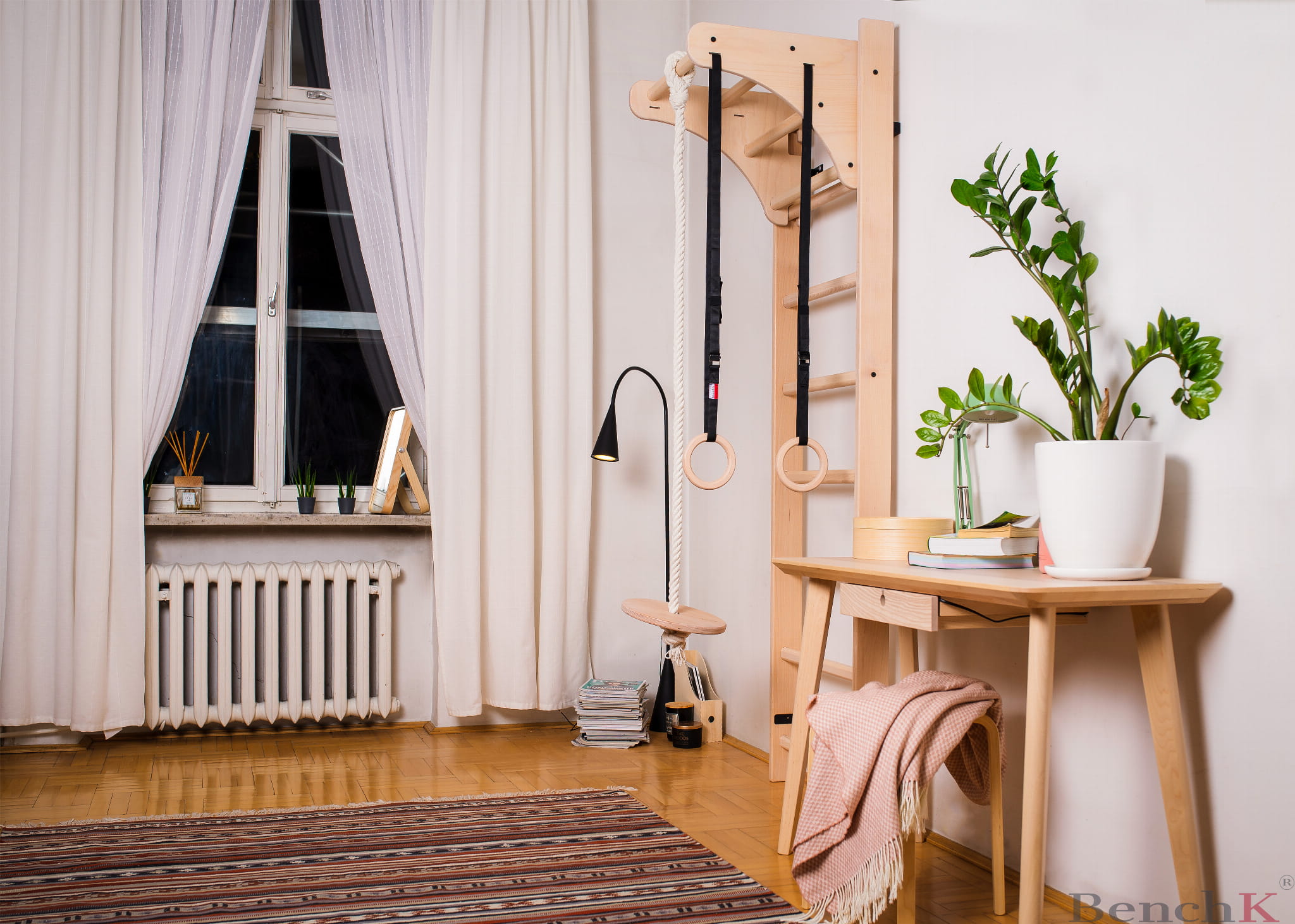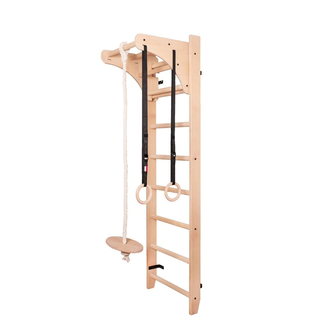 Drabinka drewniana BenchK zajmuje mało miejsca w pomieszczeniu. By ją zamontować, wystarczy wydzielić tylko 0,5 m2. Wykonana jest z wysokiej jakości drewna bukowego na nowoczesnym sprzęcie, co zapewnia gładką powierzchnię drewna i idealnie dopasowane części drabinki sportowej. Bukowa drabinka jest ręcznie olejowana naturalnym olejem, bezpiecznym dla użytkownika.