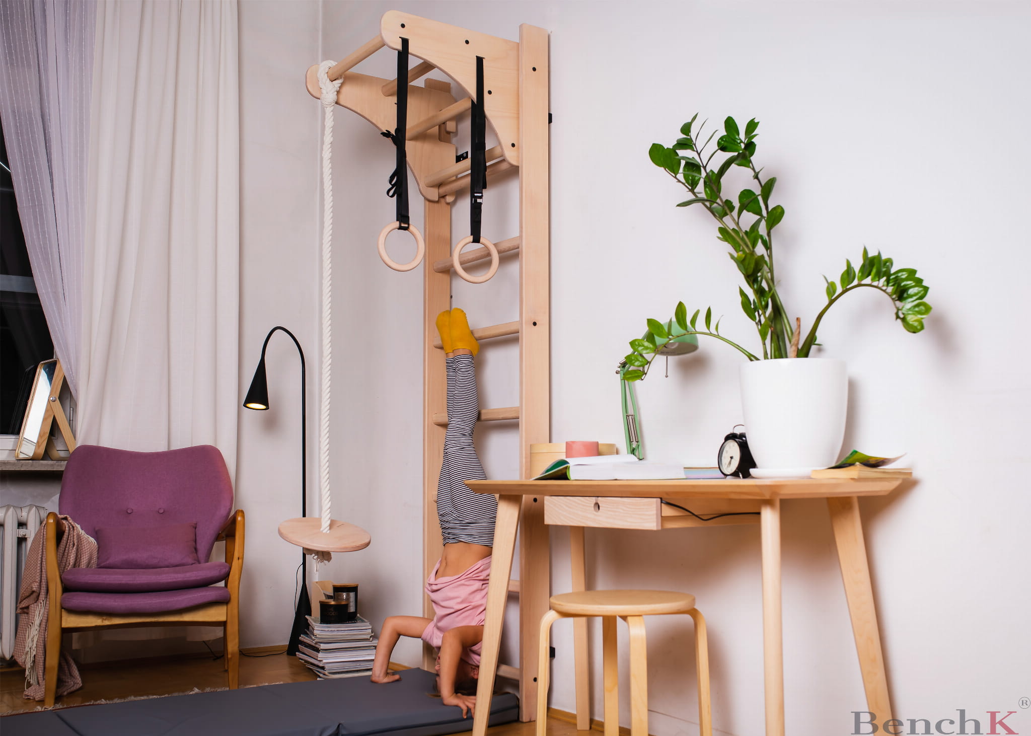 Bukowa drabinka gimnastyczna BenchK do pokoju dziecięcego motywuje młodego użytkownika do podejmowania aktywności ruchowych.