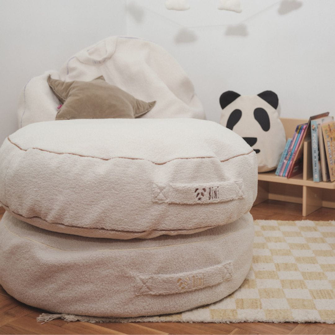 Ten model siedziska dziecięcego Bini wykonany jest z tkaniny o strukturze baranka w kolorze ecru. Wykończony bawełnianą wypustką w kolorze masła.