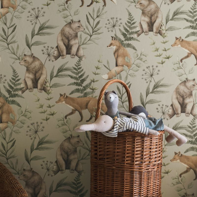 Ta cudna tapeta leśna dla dziecka zaprojektowana przez szwedzką markę Newbie i wydrukowana przez firmę Borastapeter - jedną z najstarszych i najbardziej znanych marek produkujących tapety.
