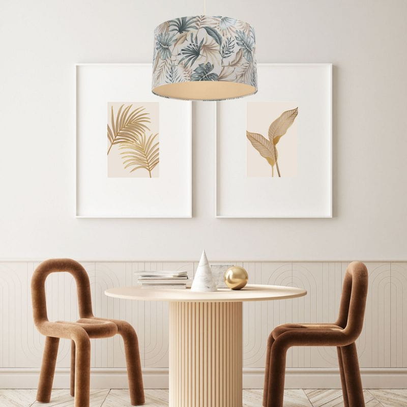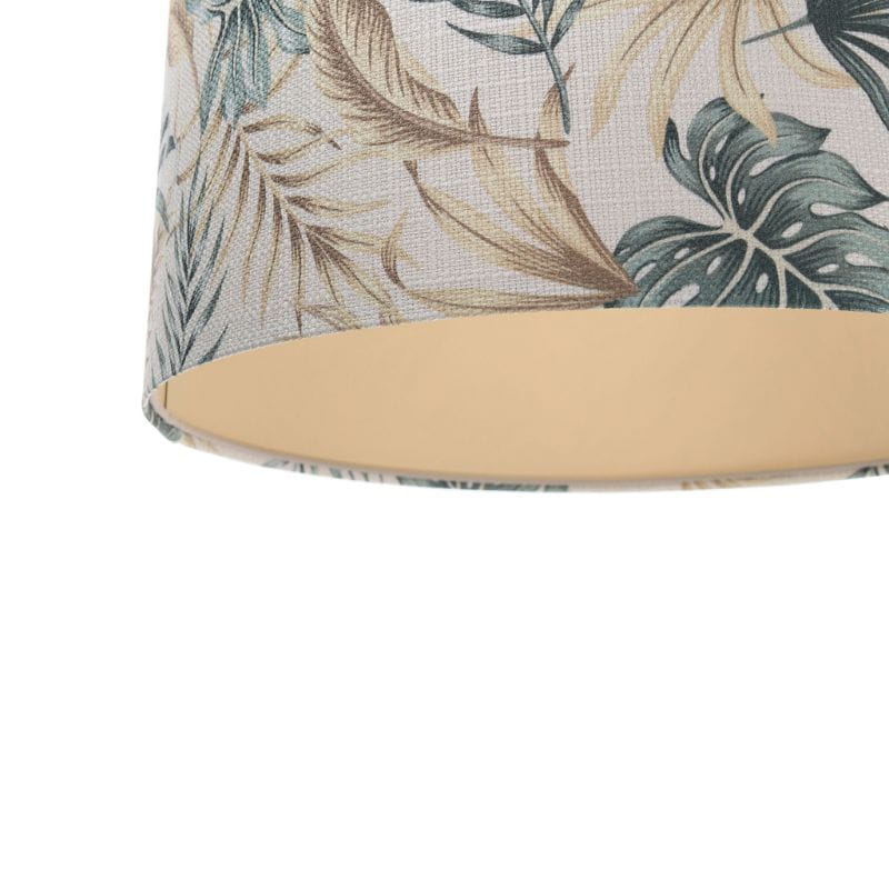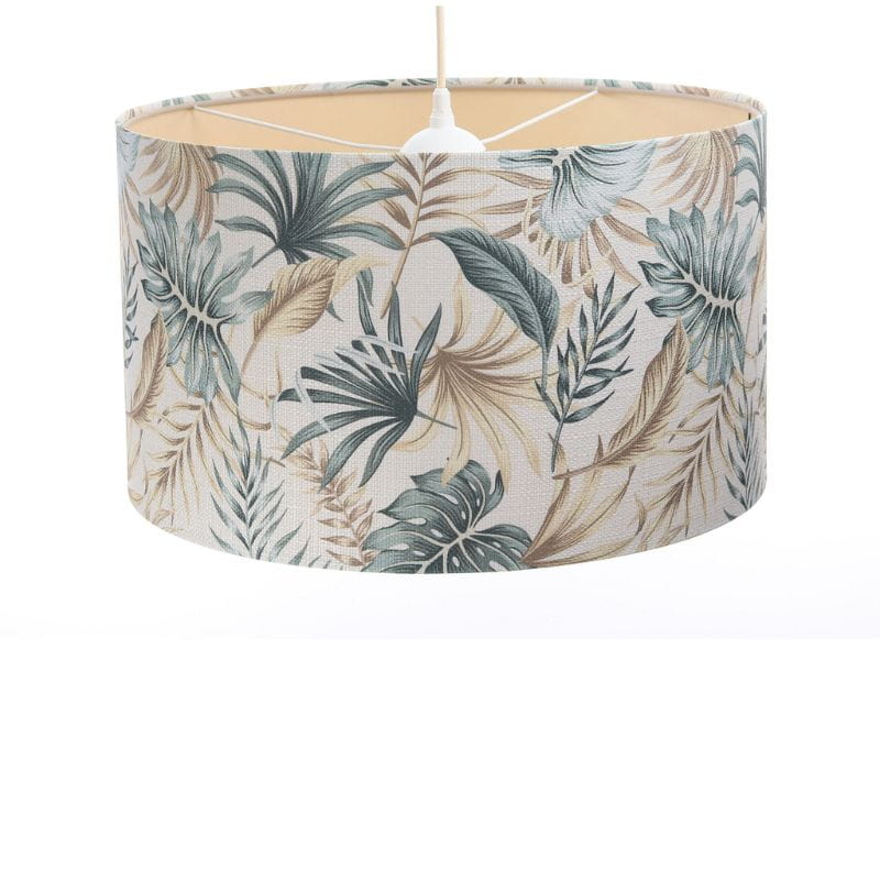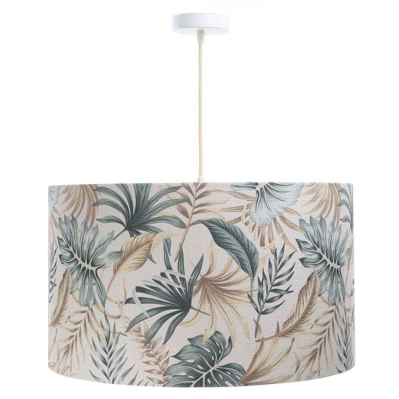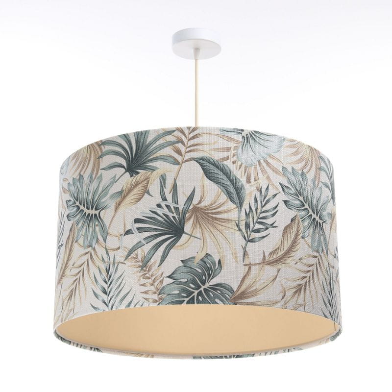 Abażur wykonany jest z tkaniny strukturalnej z kolorowym nadrukiem w liście, nałożonej na plastiku PCV z kremowo-beżowym środkiem. Abażur jest odporny na działania promieni UV, dlatego tkanina nie ulega blaknięciu w trakcie użytkowania.