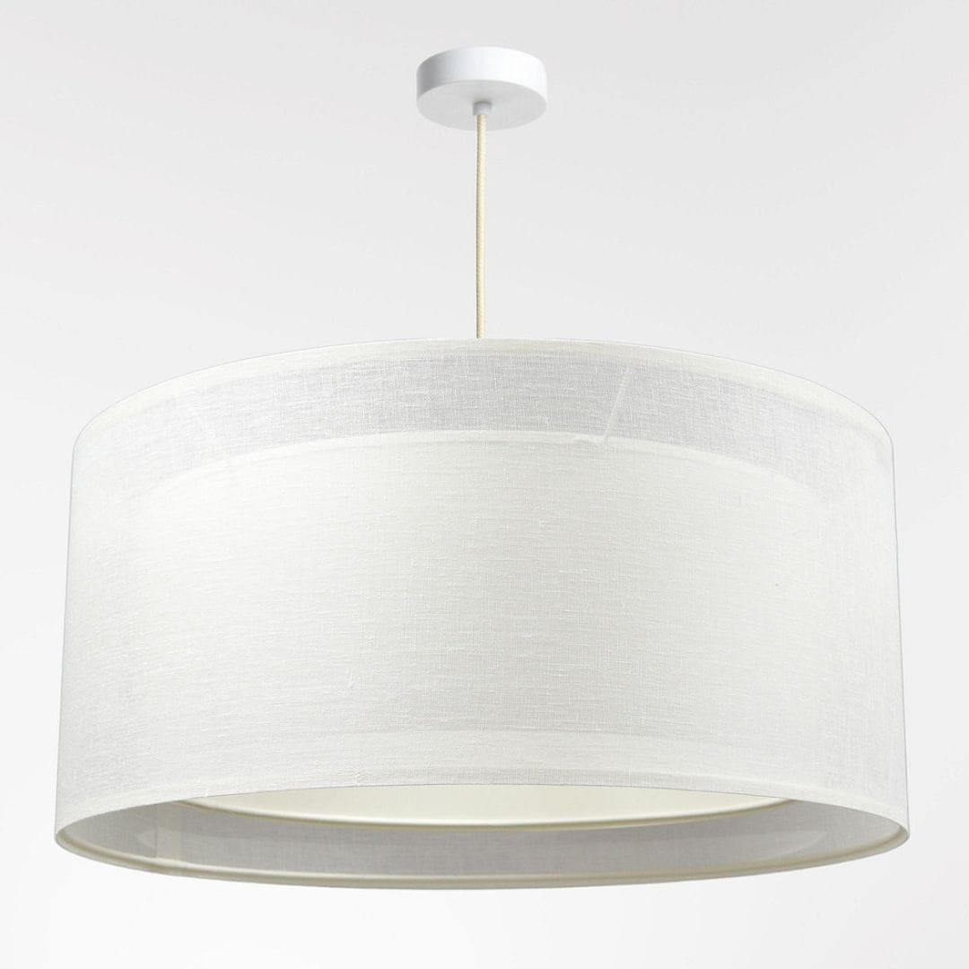 Abażur wykonany z kremowej, półprzezroczystej tkaniny lnianej, z kremowym środkiem z PCV. Abażur jest odporny na działania promieni UV, dlatego tkanina nie ulega blaknięciu w trakcie użytkowania.