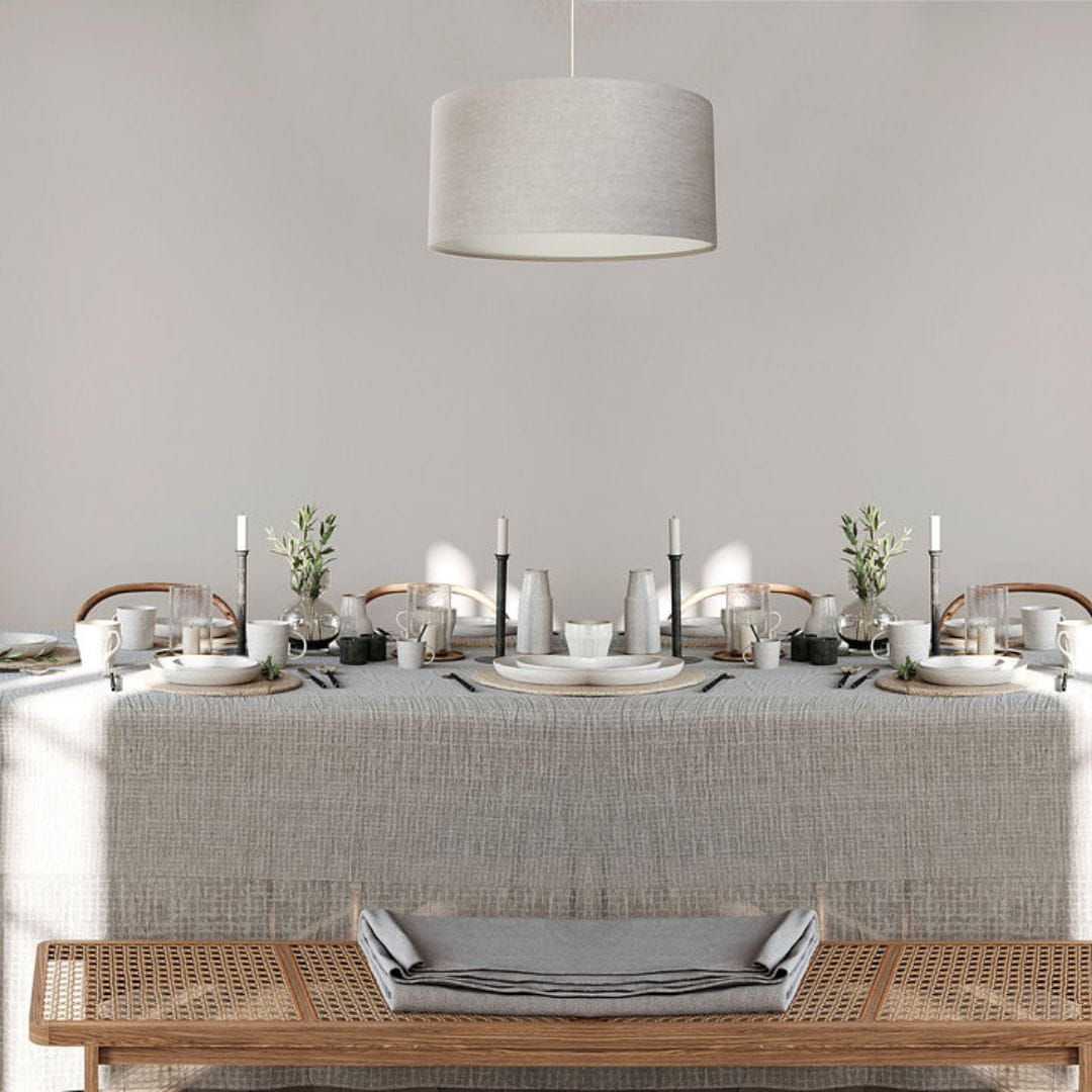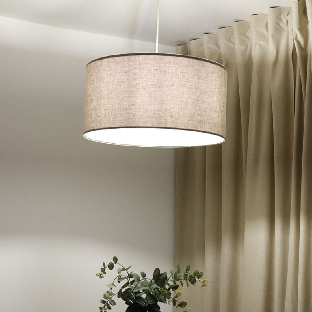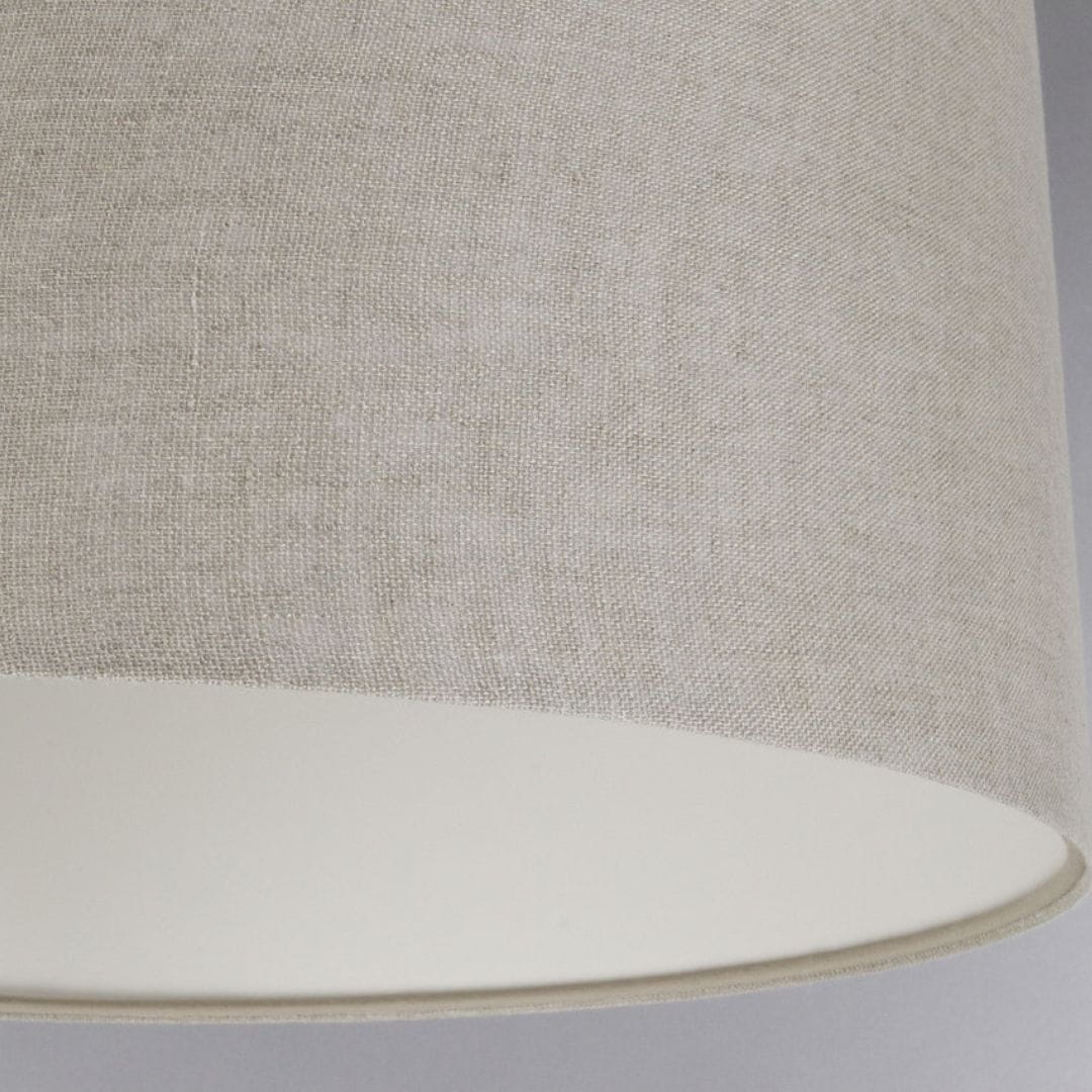 Abażur wykonany z beżowej tkaniny lnianej na kremowym PCV. Abażur jest odporny na działania promieni UV, dlatego tkanina nie ulega blaknięciu w trakcie użytkowania.