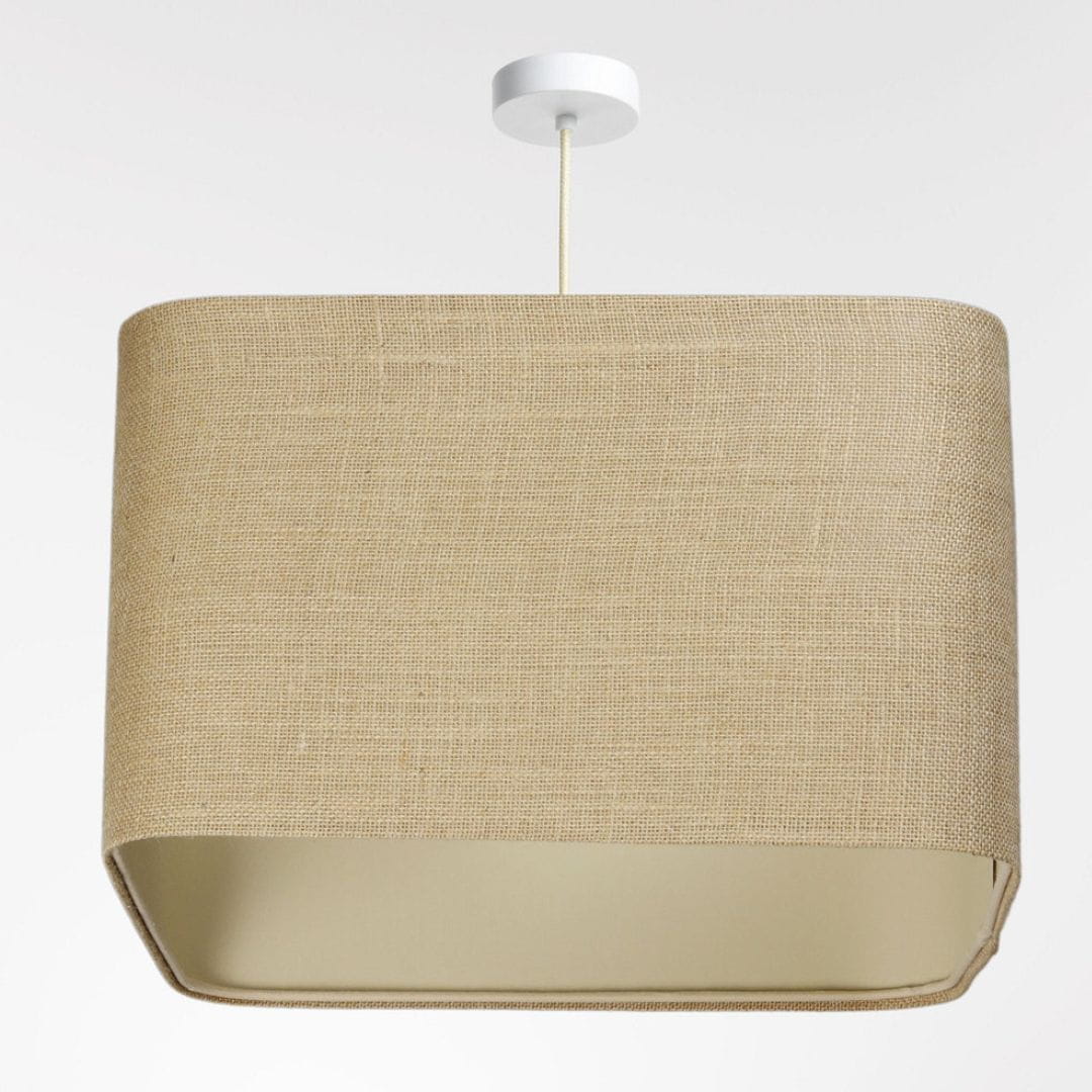 Abażur wykonany jest z juty, nałożonej na beżowym plastiku. Abażur jest odporny na działania promieni UV, dlatego tkanina nie ulega blaknięciu w trakcie użytkowania.