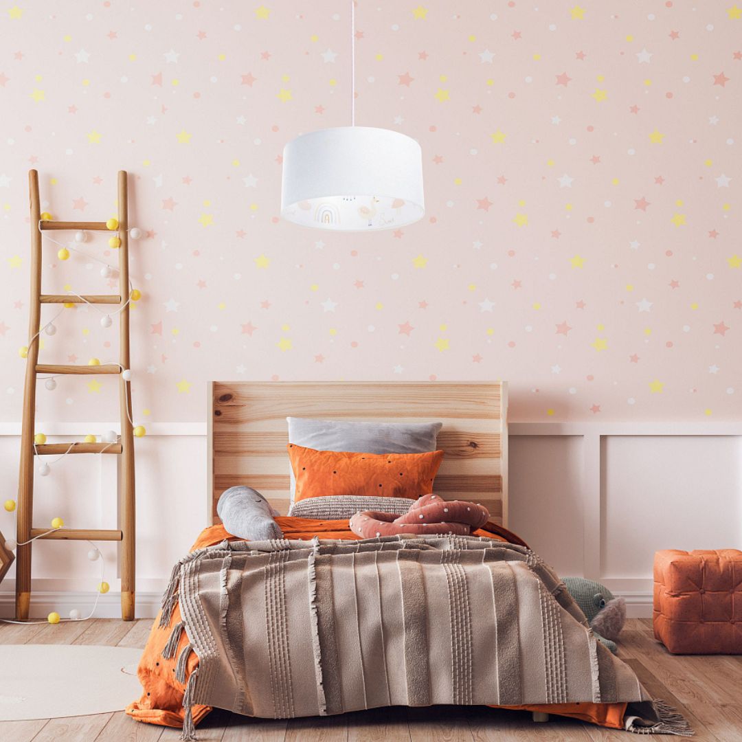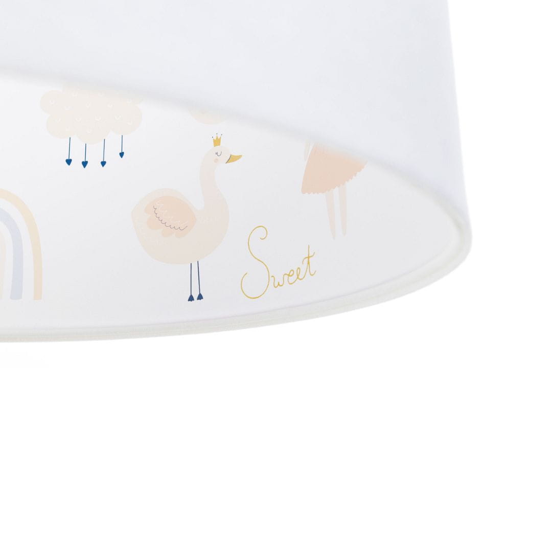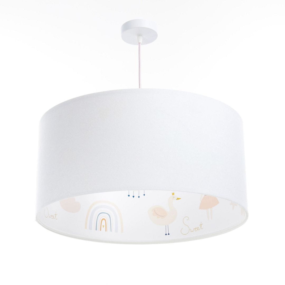Dodaj magii do pokoju swojej córki dzięki uroczej lampie wiszącej z pastelowym motywem tęczy, chmurek, króliczka i łabędzia. Ta urocza lampa z przeniesie Twoje dziecko do bajkowego świata. Subtelne kolory i szczegółowe ilustracje sprawiają, że lampa nie tylko oświetla, ale także dekoruje wnętrze. Idealna do tworzenia magicznej atmosfery podczas zabaw i wieczornych bajek.