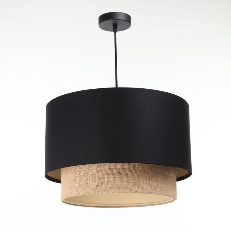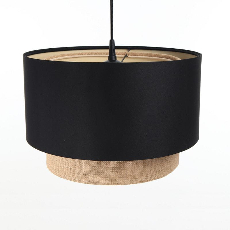 Abażur wykonany jest naturalnej juty w połączeniu z czarną satyną, nałożone na plastiku PCV z kremowo-beżowym środkiem. Abażur jest odporny na działania promieni UV, dlatego tkanina nie ulega blaknięciu w trakcie użytkowania.