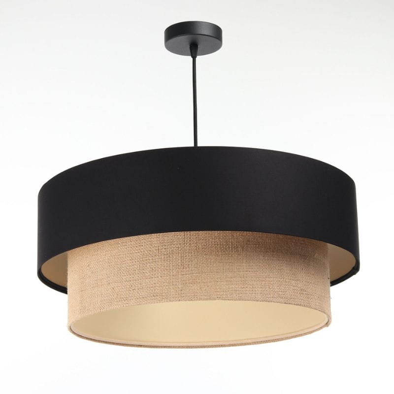 Abażur wykonany jest naturalnej juty w połączeniu z czarną satyną, nałożone na plastiku PCV z kremowo-beżowym środkiem. Abażur jest odporny na działania promieni UV, dlatego tkanina nie ulega blaknięciu w trakcie użytkowania.