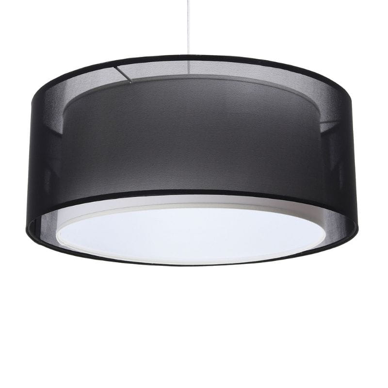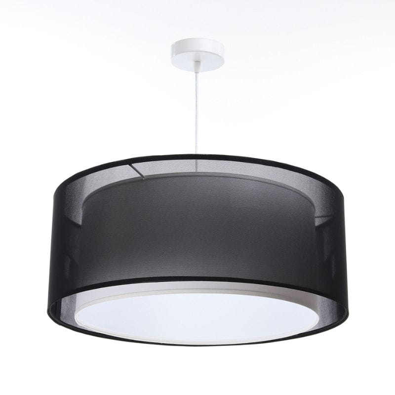 Dwuściankowy abażur wykonany jest z tkaniny półprzezroczystej i białego tworzywa sztucznego.