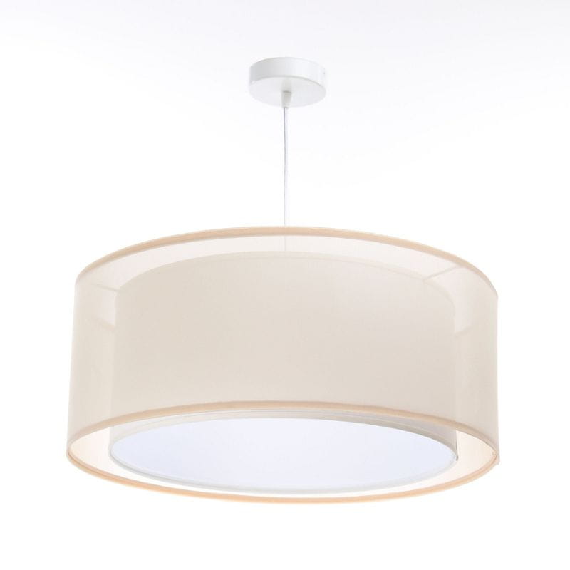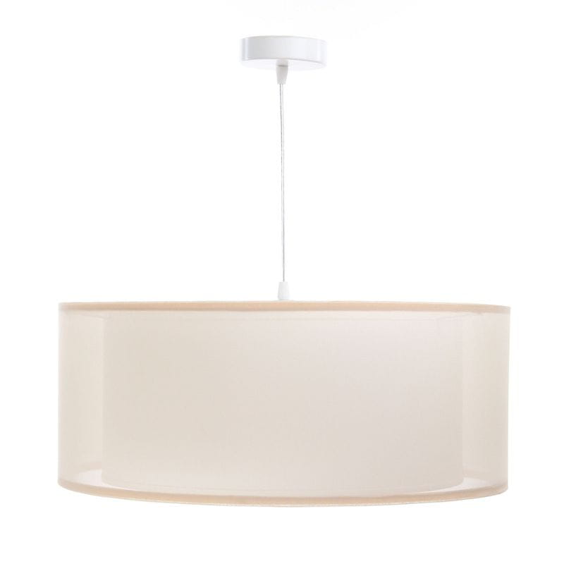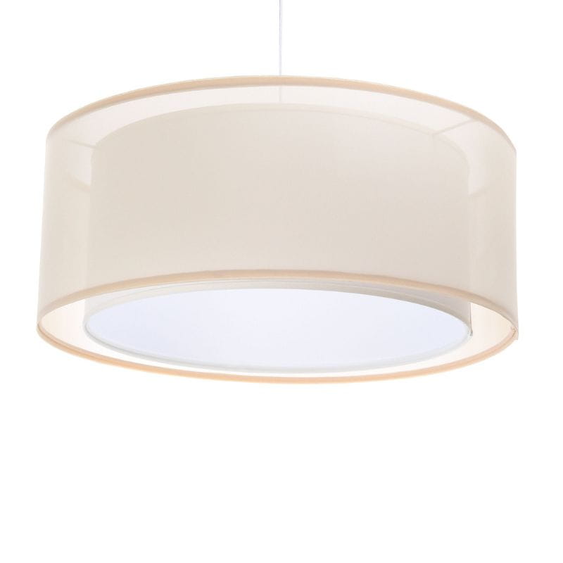 Dwuściankowy abażur wykonany jest z tkaniny półprzezroczystej i białego tworzywa sztucznego.