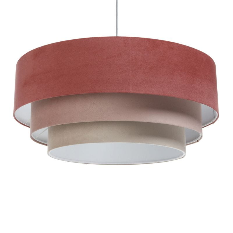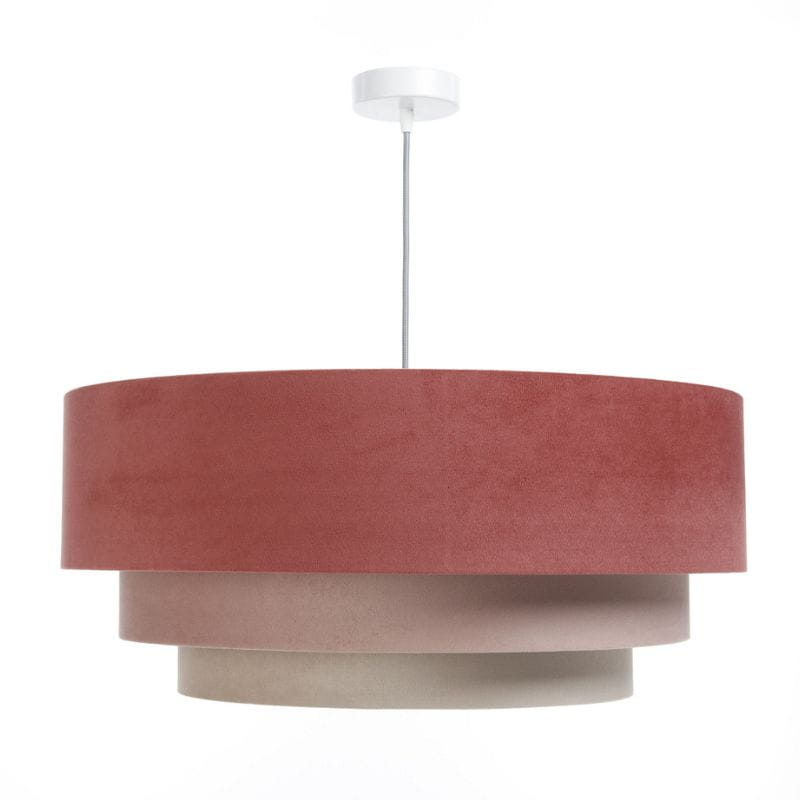 Abażur wykonany jest z tkaniny welurowej w kolorze czerwieni, beżu oraz różu na jasnoszarym tworzywie PP. Abażur jest odporny na działania promieni UV, dlatego tkanina nie ulega blaknięciu w trakcie użytkowania.