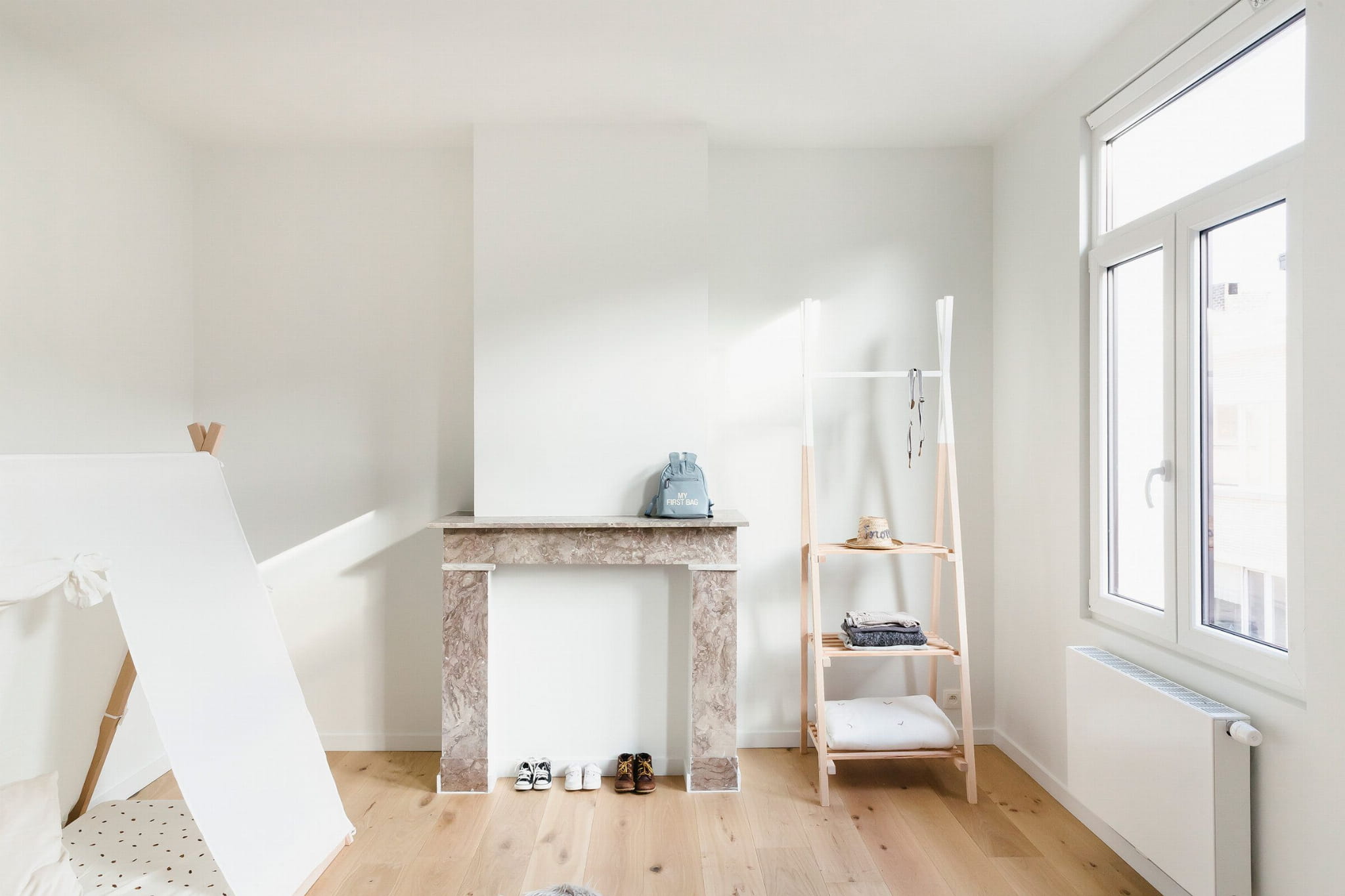 Łóżko dziecięce w minimalistycznym stylu wykonane z drewna bukowego w naturalnym kolorze, z białymi elementami.