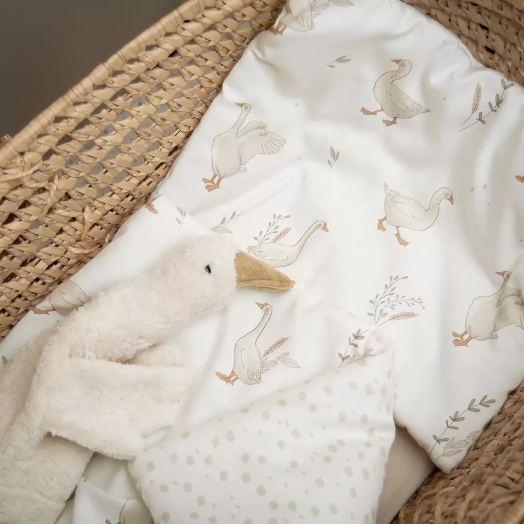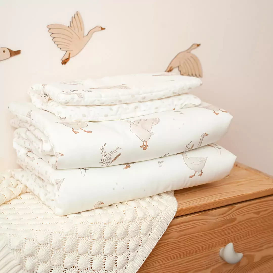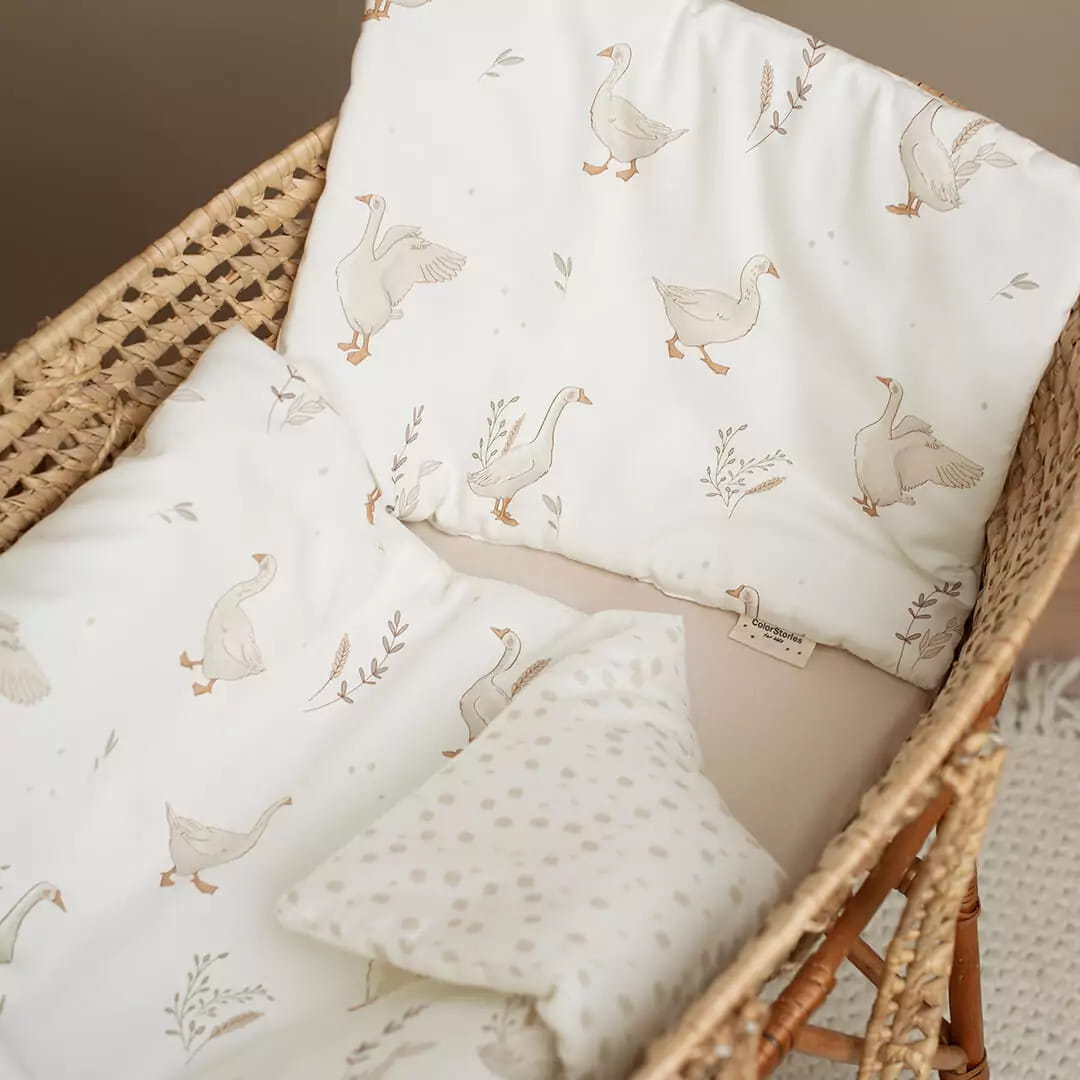 Pościel dla niemowlaka w urocze gąski nie tylko ładnie wygląda i tworzy przytulne miejsce dla Twojego maluszka, ale jest wyjątkowo miękka, bezpieczna i naturalna.
