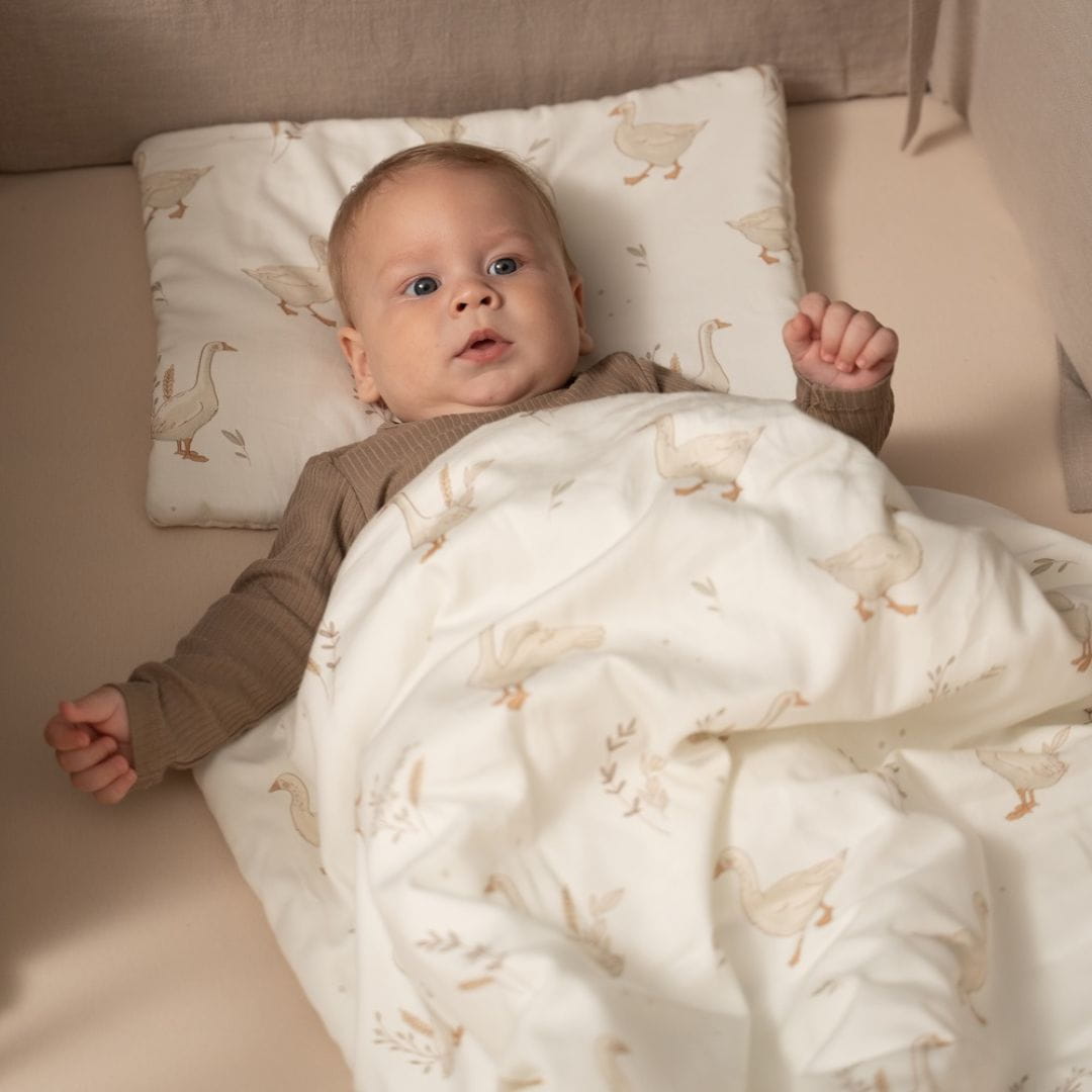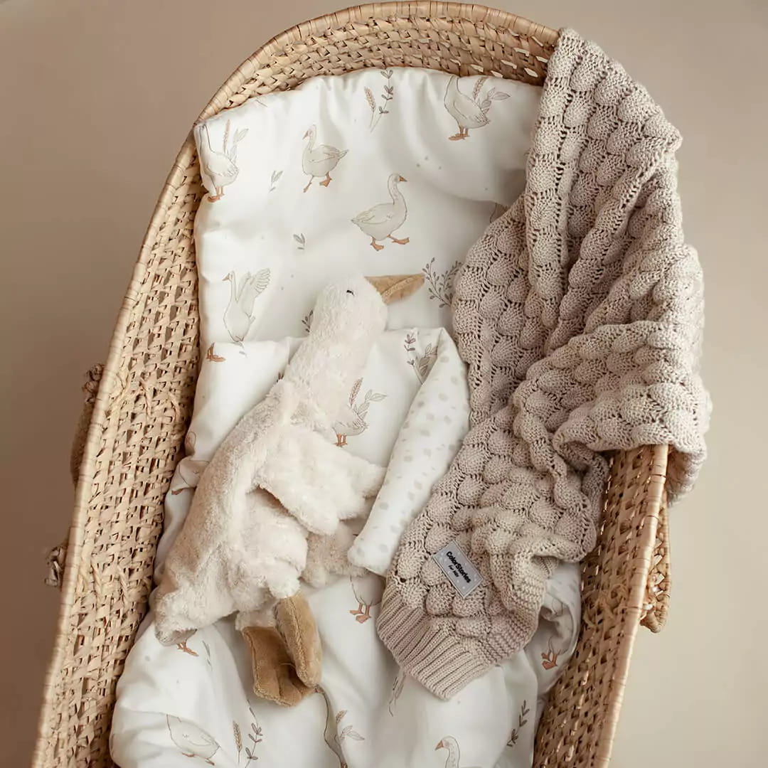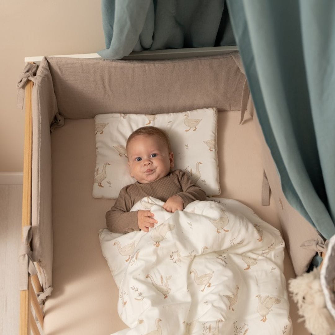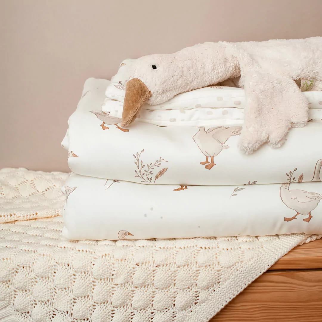 Pościel dla niemowlaka w urocze gąski nie tylko ładnie wygląda i tworzy przytulne miejsce dla Twojego maluszka, ale jest wyjątkowo miękka, bezpieczna i naturalna.