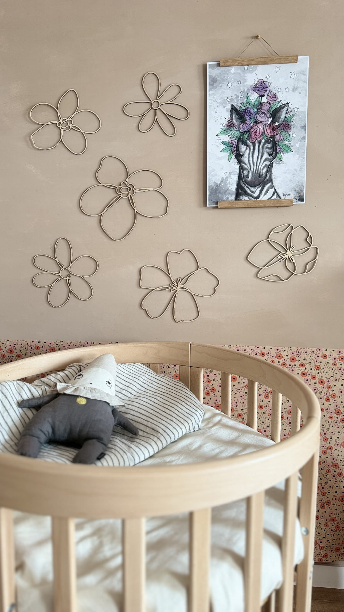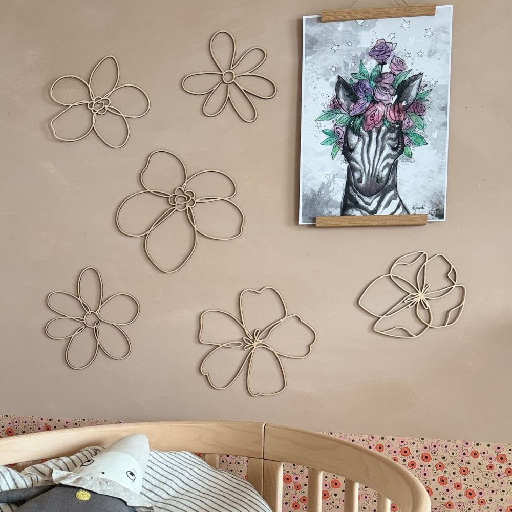 Dekoracja składa się z 6 kwiatów w różnych rozmiarach, dzięki czemu możesz wyczarować niepowtarzalną kompozycję w pokoju dziecka. Każdy z kwiatów został precyzyjnie wycięty z delikatnej sklejki w naturalnym kolorze i wyszlifowany, co gwarantuje gładkie krawędzie i bezpieczeństwo dla dzieci.