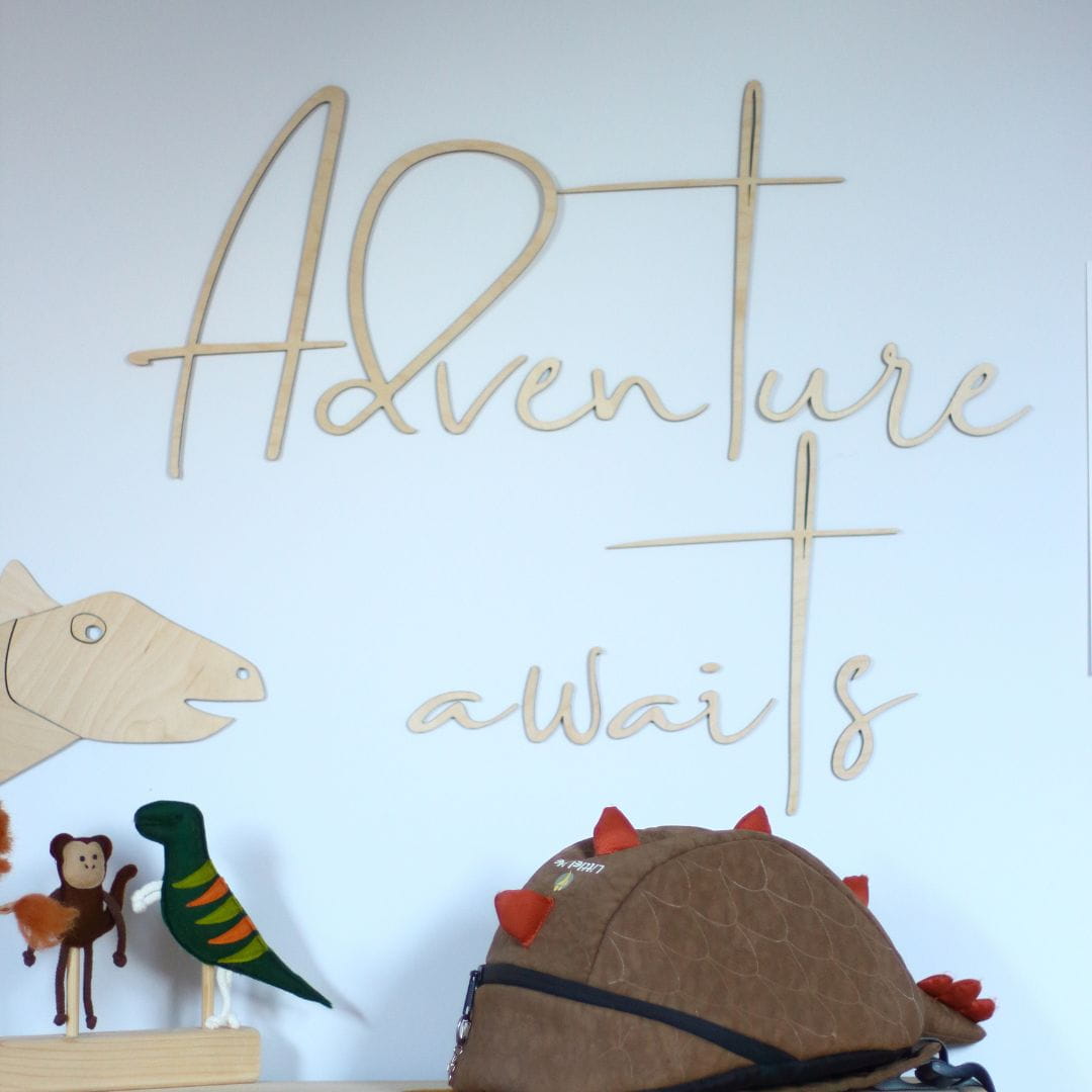 Wyjątkowy napis Adventure Awaist dekoracja ścienna do pokoju dziecka, który kocha przygody :) Będzie pięknie prezentował się np. obok biblioteczki, nad komodą lub łóżkiem.