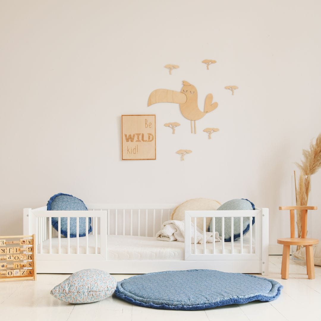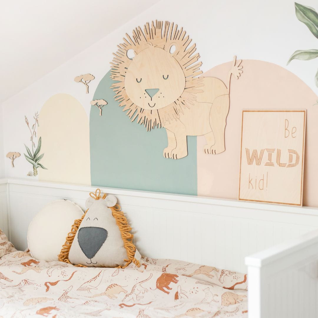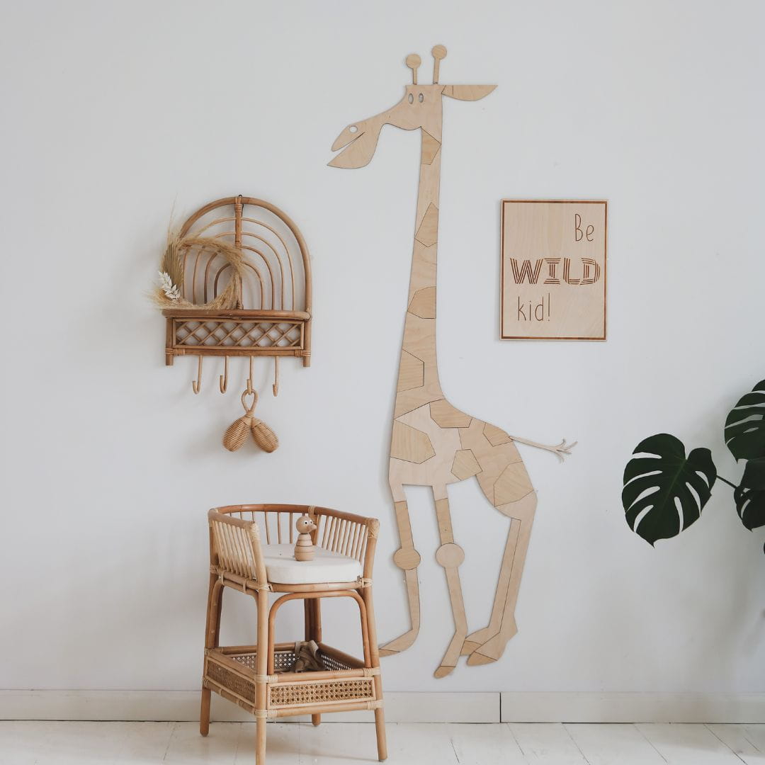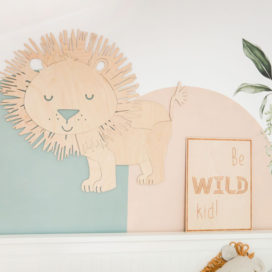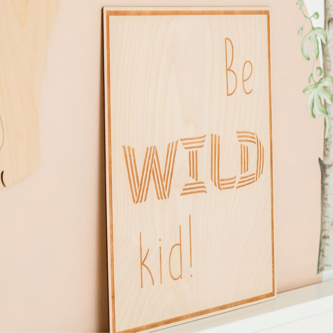 Grawerowany obrazek ze sklejki z napisem "Be Wild Kid" — prawdziwe arcydzieło, które wyróżnia się spośród standardowych dekoracji dziecięcych, dodając wnętrzu niepowtarzalnego charakteru.