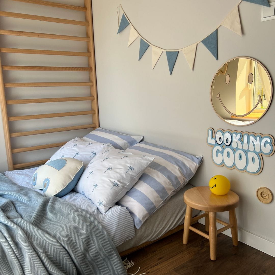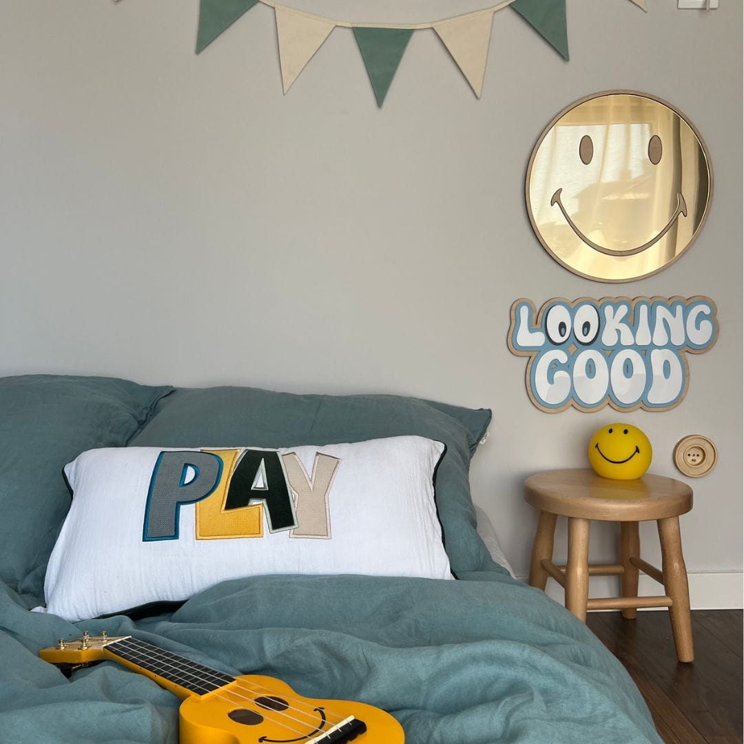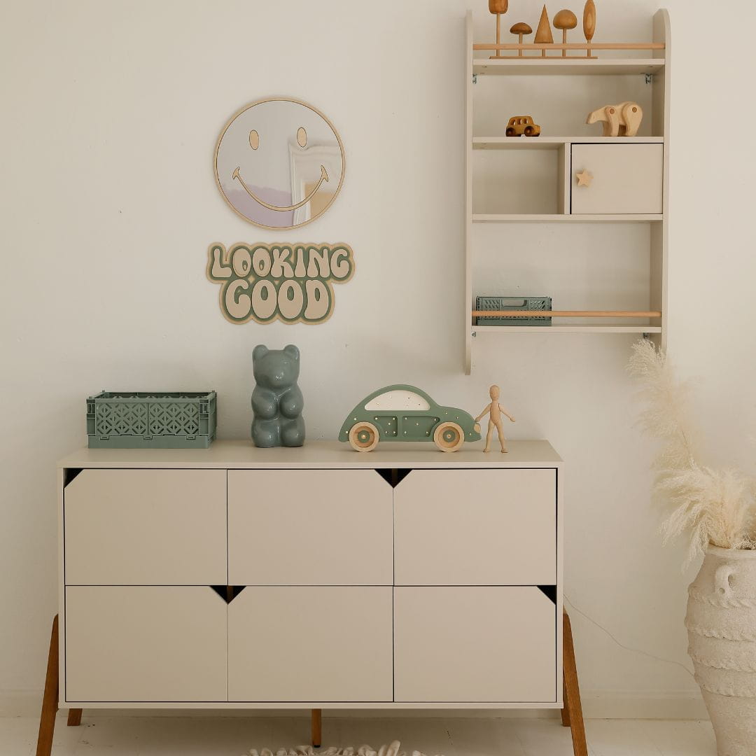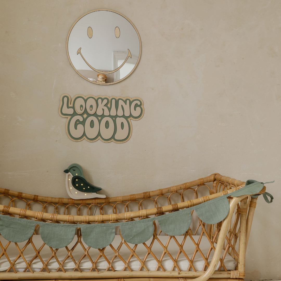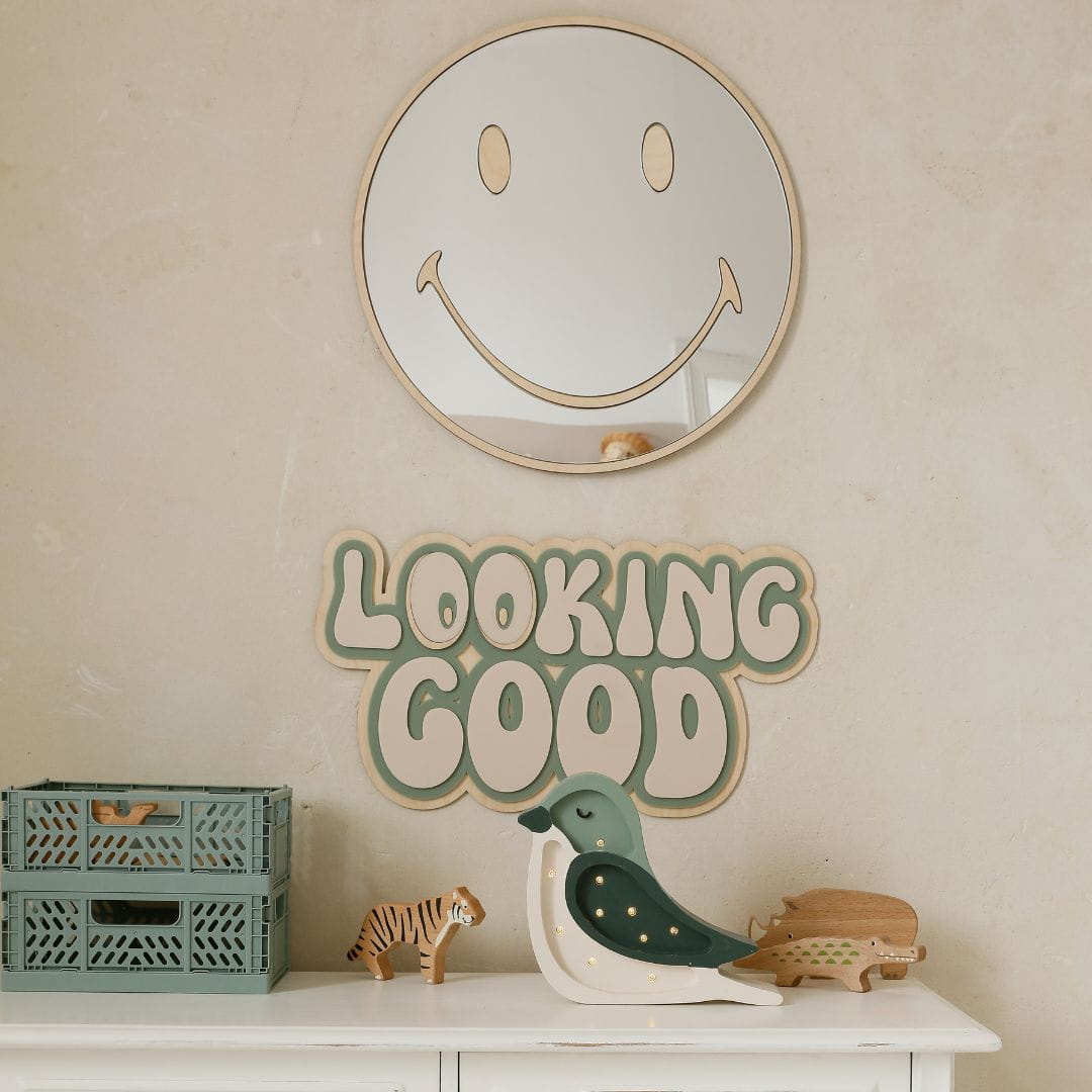 Napis ścienny "Looking Good"- idealny dodatek do każdego pokoju dziecięcego, pokoju zabaw lub sypialni. To urocze dzieło sztuki ściennej zostało zaprojektowane, aby inspirować i zachwycać, łącząc eleganckie materiały – drewno i akryl.