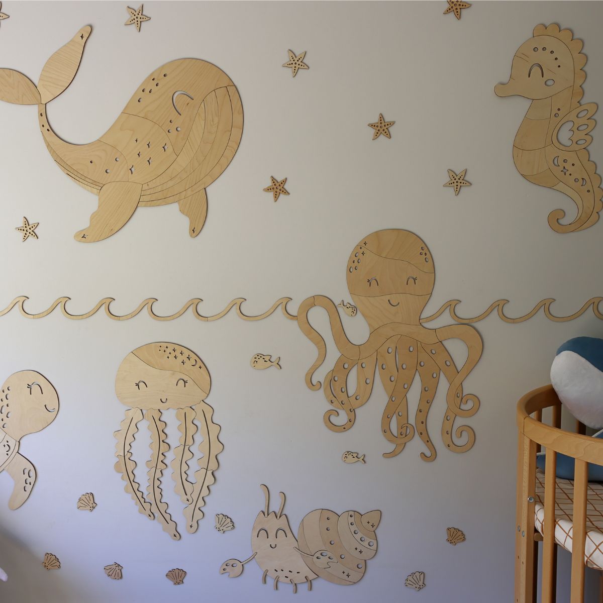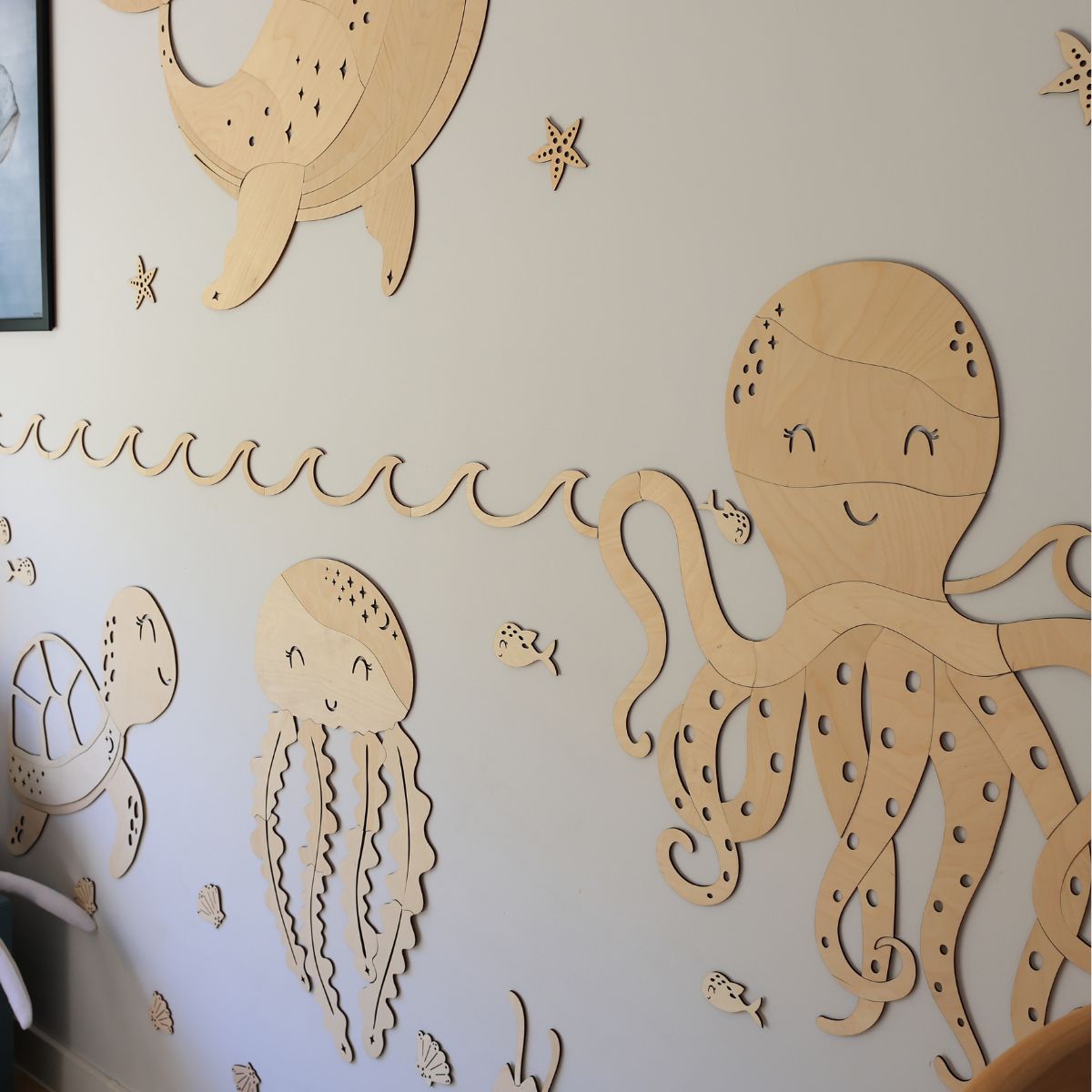 Ta drewniana dekoracja świetnie wpisuje się w styl Montessori oraz pokoje z morskim motywem. Doskonale sprawdzi się w przedszkolach, kącikach czytelniczych i przestrzeniach dla małych odkrywców, którzy kochają ocean i jego tajemnice.